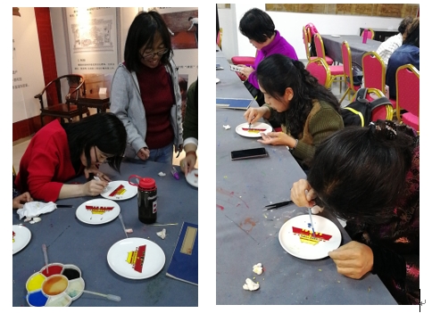 随后,老师们又体验了景泰蓝制作中的掐丝和上色环节。以天安门为图案,用铝丝(代替铜丝)勾勒出线条,用染料填充颜色,最后用胶覆盖。制作过程需要足够的耐心和细心,老师们认真仔细的制作作品,同时也体会着传统工艺匠人们精湛技艺背后的辛苦付出。