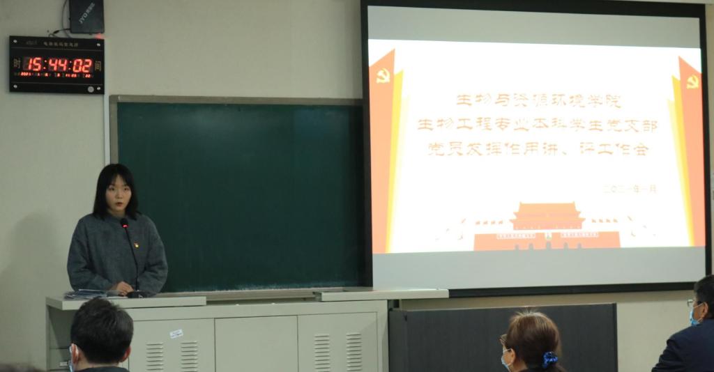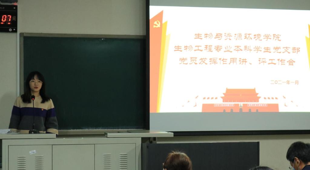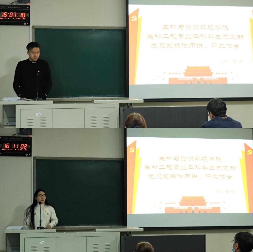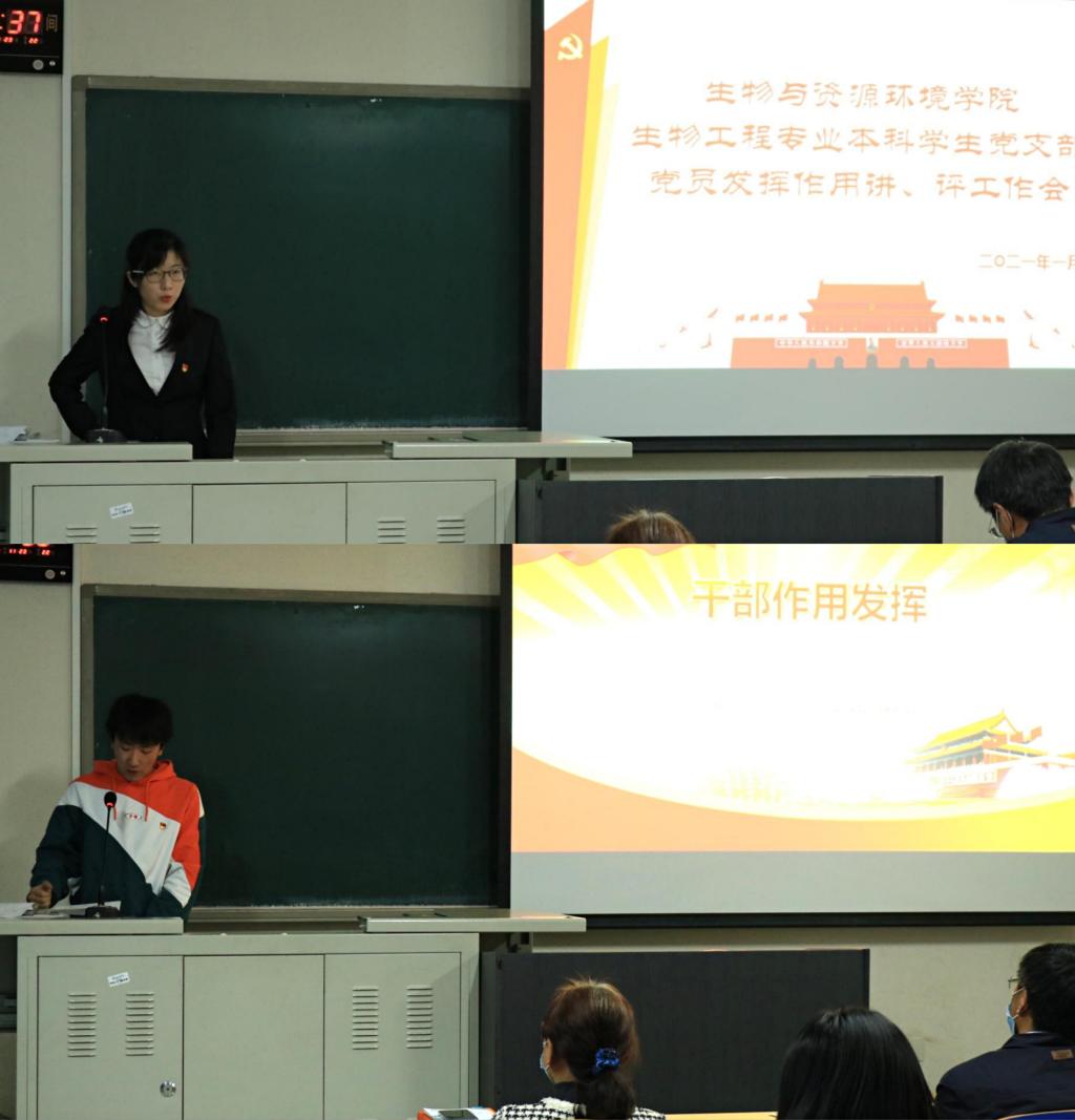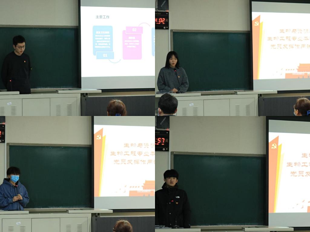 预备党员全修治平介绍了他参加生物工程1班团日活动的情况,他用习近平总书记在国家公祭日的讲话对生物工程1班进行了思想指导工作,并指正了在参加团日活动过程种发现的一些问题;预备党员刘诗园结合自己的学习经验对生物工程专业的员工进行了朋辈指导,讲解了考试的重点题型。点评人生物工程2班班长甄磊就一学期以来,党支部积极为班级同学进行学业、生活以及思想素质的引领与指导表示感谢,并表明在今后的日子里积极向党组织学习,做好班级建设建设。