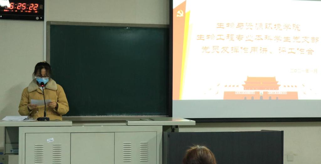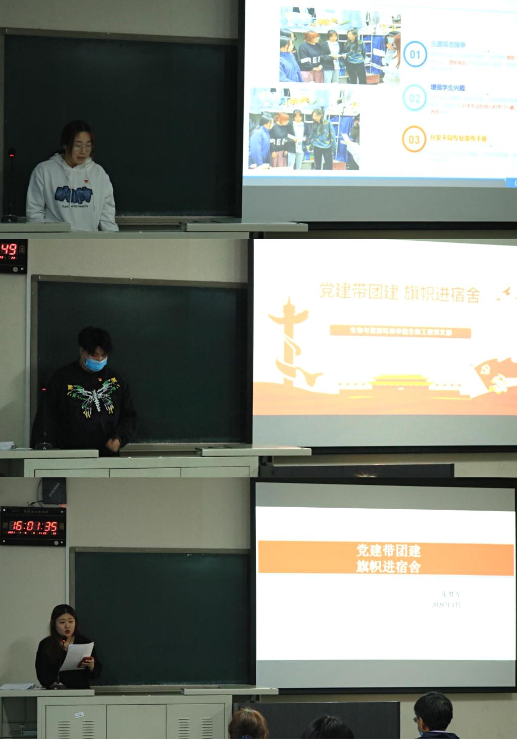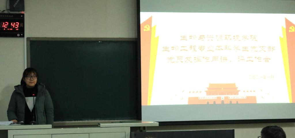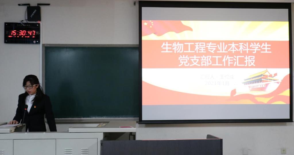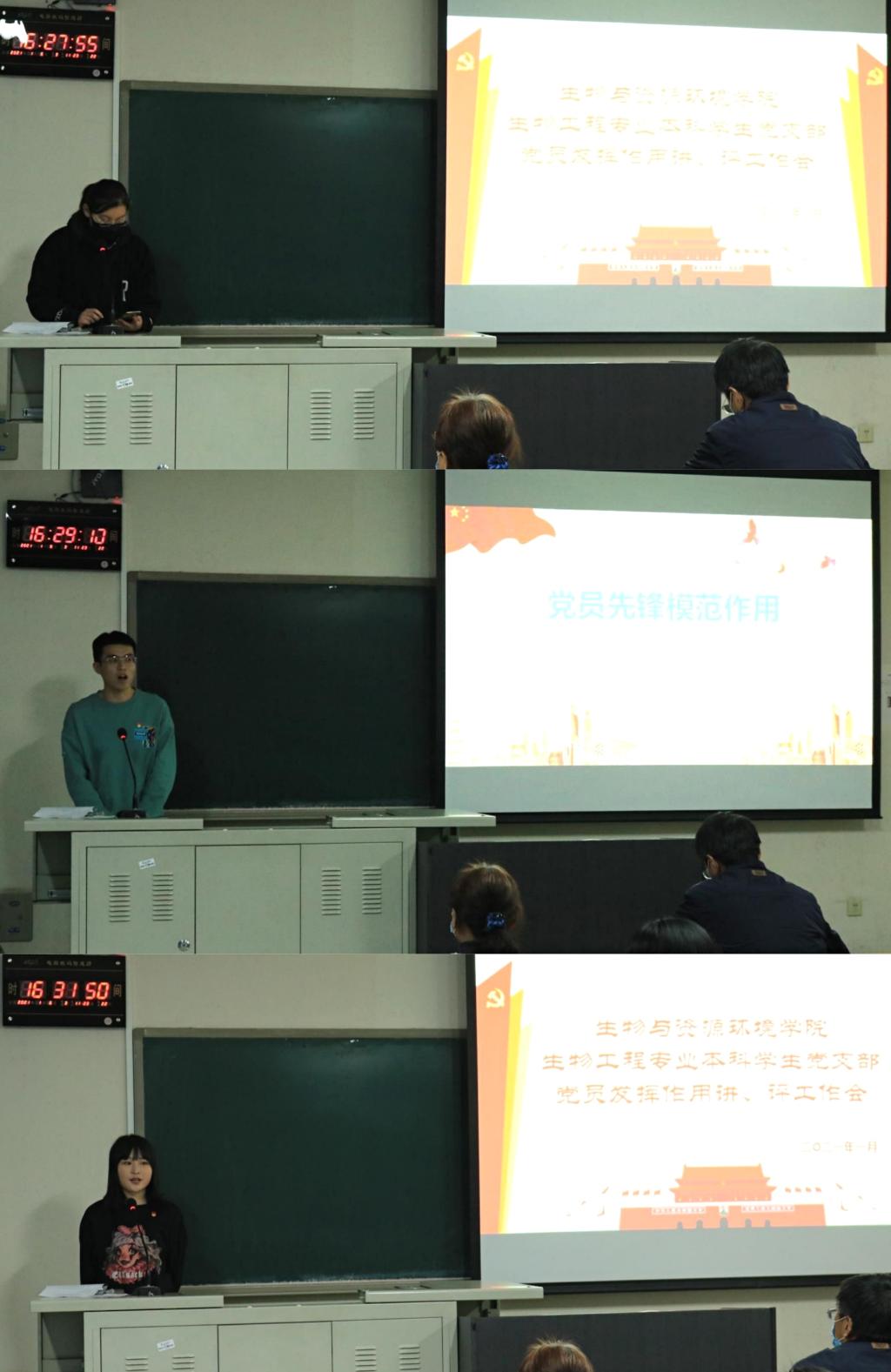 预备党员全修治平介绍了他参加生物工程1班团日活动的情况,他用习近平总书记在国家公祭日的讲话对生物工程1班进行了思想指导工作,并指正了在参加团日活动过程种发现的一些问题;预备党员刘诗园结合自己的学习经验对生物工程专业的员工进行了朋辈指导,讲解了考试的重点题型。点评人生物工程2班班长甄磊就一学期以来,党支部积极为班级同学进行学业、生活以及思想素质的引领与指导表示感谢,并表明在今后的日子里积极向党组织学习,做好班级建设建设。