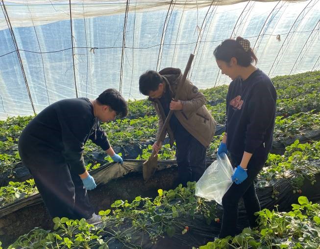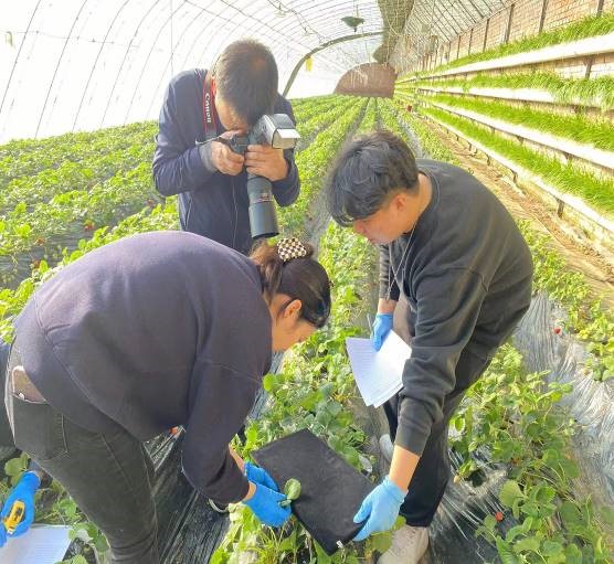 首先确定了取样的草莓大棚,并设计了随机取样方案。同学们在杨老师的带领下迅速的进行距离测量,随机取样的工作。在每个随机取样点我们进行了草莓生长状态的测量,并对草莓的叶片、果实进行了拍照,并采集成熟果实,最后在每个大棚里随机取样草莓整株,以便于后续在实验室的分析工作。