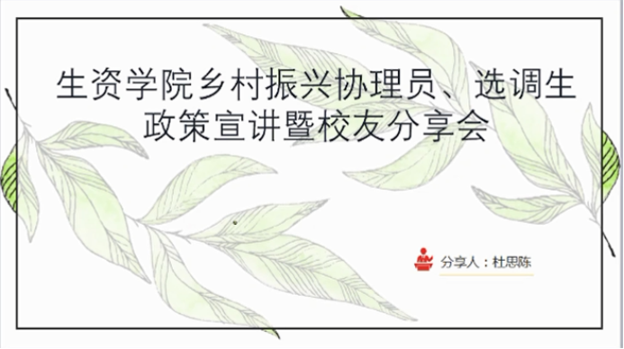 现从事水务工作的杜思陈学长分享了自己去年报考乡村协理员的经验与工作经历、从工作环境、工作内容、待遇保障和发展前景几方面详细介绍了乡村协理员的优势,鼓励同学们积极参与,为乡村振兴奉献一份力量,成为靓丽青春风景线中的一员。