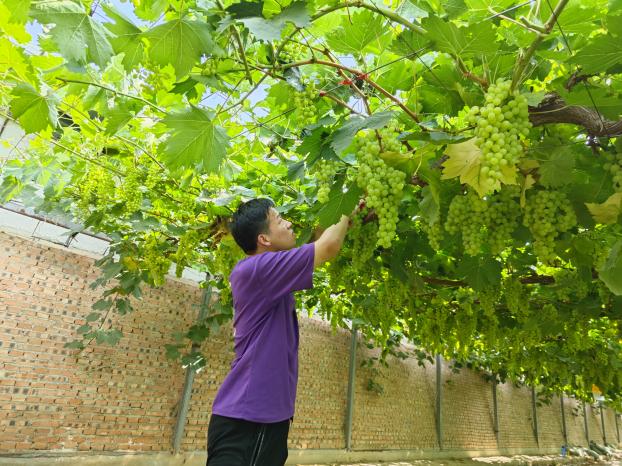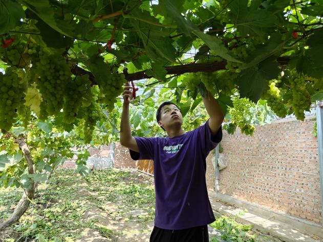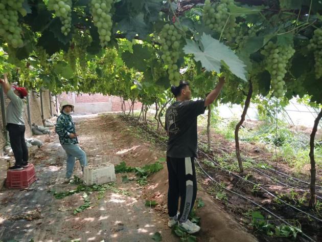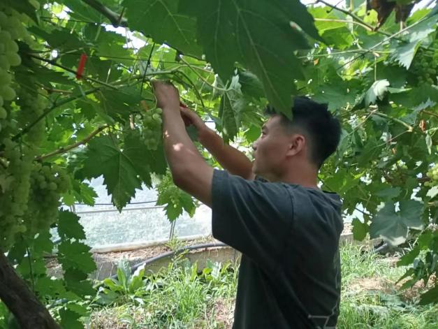夏天气温较高,光照强烈,作物易出现徒长的现象,这时就需要及时对作物进行摘心。葡萄摘心可以合理调节植株体内营养物质的均匀分配和运输,使养分集中供给有效花果的需要,减少养分消耗,有效提高葡萄的坐果率。7月8日,金粟种植专业合作社刘师傅向小院员工崔武琦和欧梦喆讲解和示范了葡萄摘心的关键点。经过刘师傅耐心教导,小院员工们便开始行动起来。起初俩人的效率并不高,一旁的刘师傅继续指导道“你们别不忍心,就按照我说的方法放心大胆的剪”,经过一段时间的实践,俩人逐渐掌握了葡萄摘心的技术,干得越来越像样。“夏季这些徒长的枝条不仅影响葡萄采光,还浪费营养,你要想尽办法找这些枝条的麻烦,把它剪掉。农业劳动看似简单,其实蕴含着科学原理与自然规律,想要做好还需要实践熟练技术,并理解其中原理。