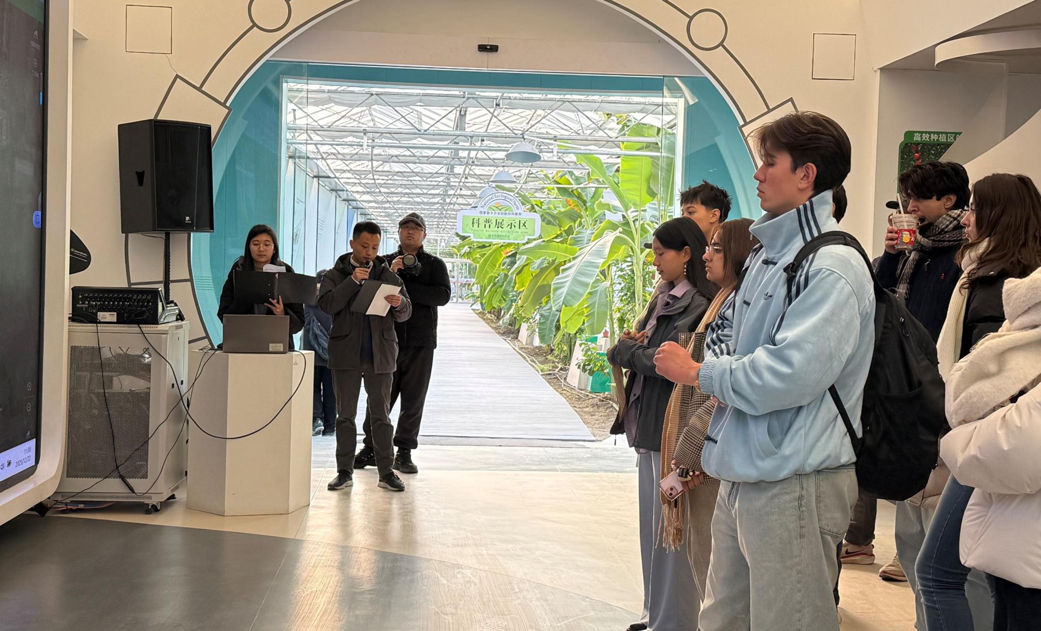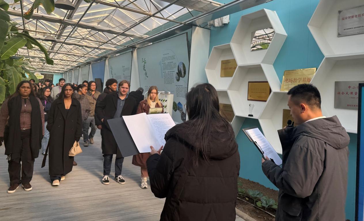 本次活动通过实地参观与现场讲解相结合的形式,向国际青年群体集中展示北京市都市型现代农业发展成果与智慧农业应用实践。活动在北京市朝阳区来广营乡的朝来农艺园连栋温室内举行。参观过程中,由朝来农艺园工作人员石子航和科技小院指导老师陈永攀担任中英文双语讲解,赵晓燕老师和高坦坦老师协同翻译与补充说明,围绕园区建设背景、设施农业技术和数字化管理模式,为职工们系统介绍中国设施农业与智慧农业的发展路径。