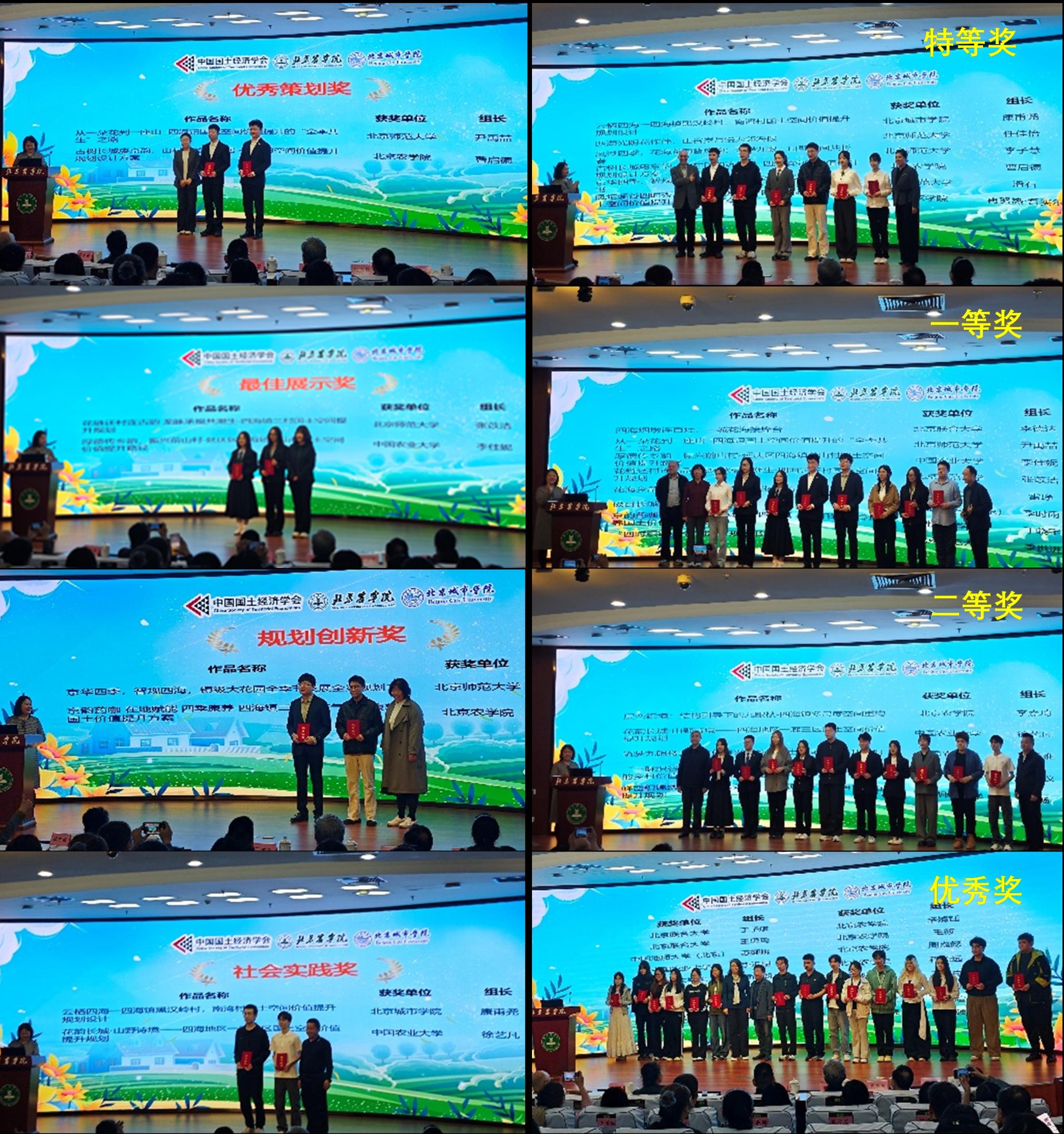 随后,进入决赛的团队在各分会场进行了作品展示。各团队围绕乡村国土空间优化、生态价值提升、产业布局与文化传承等主题展开严谨答辩。经过专家评审组公平公正、严格细致的评议,大赛最终评选出特等奖6项、一等奖8项、二等奖10项,单项奖8名,充分展现了当代老员工扎实的专业功底与创新实践能力。其中,特等奖及一等奖总评成绩前两名参赛团队将代表北京赛区进军全国总决赛。在闭幕式与颁奖典礼上,与会嘉宾为获奖团队颁奖,现场气氛热烈。