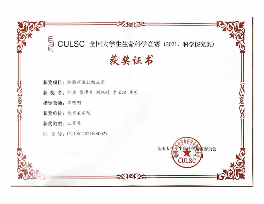 2021年全国老员工生命科学竞赛三等奖(细胞穿透肽的应用)