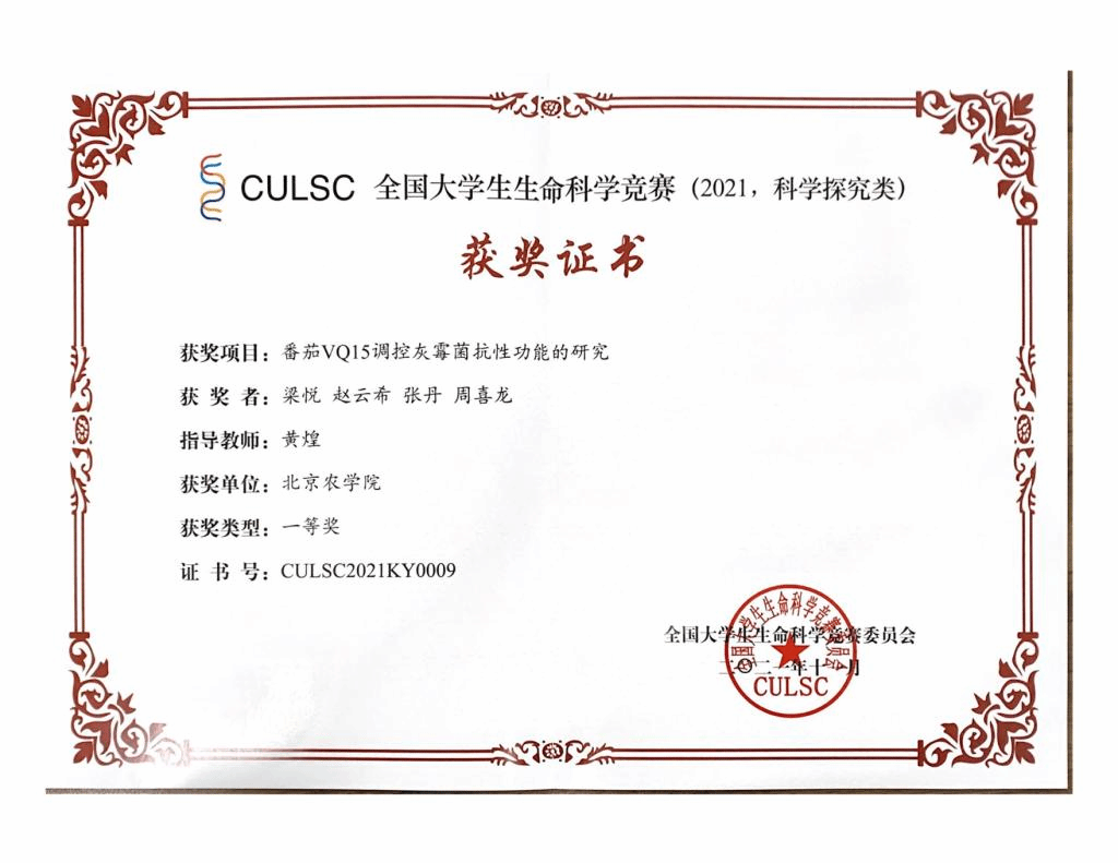 2021年全国老员工生命科学竞赛一等奖(番茄VQ15调控灰菌霉抗性功能的研究)