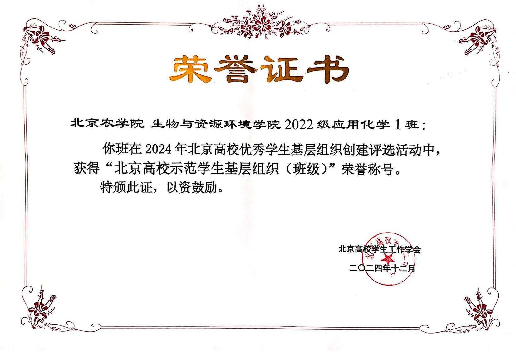 2022级应用化学1班荣获2024年“北京高校示范员工基层组织(班级)”荣誉称号