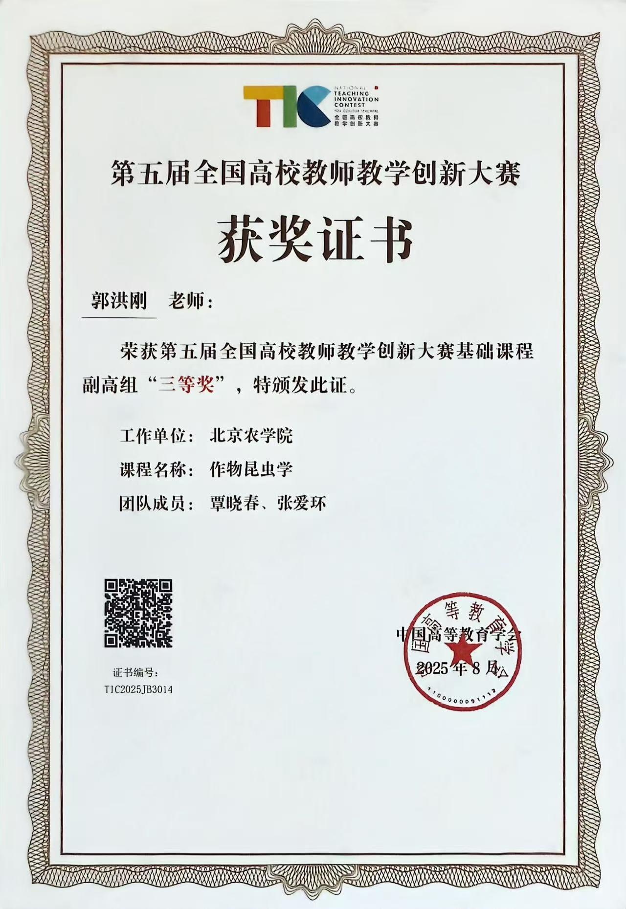 8月19日,由教育部高等教育司指导,中国高等教育学会主办的第五届全国高校教师教学创新大赛总结大会在北京理工大学举行。304永利集团植保系教师郭洪刚带领的《作物昆虫学》课程团队(成员:覃晓春、张爱环)荣获基础课程副高组三等奖。