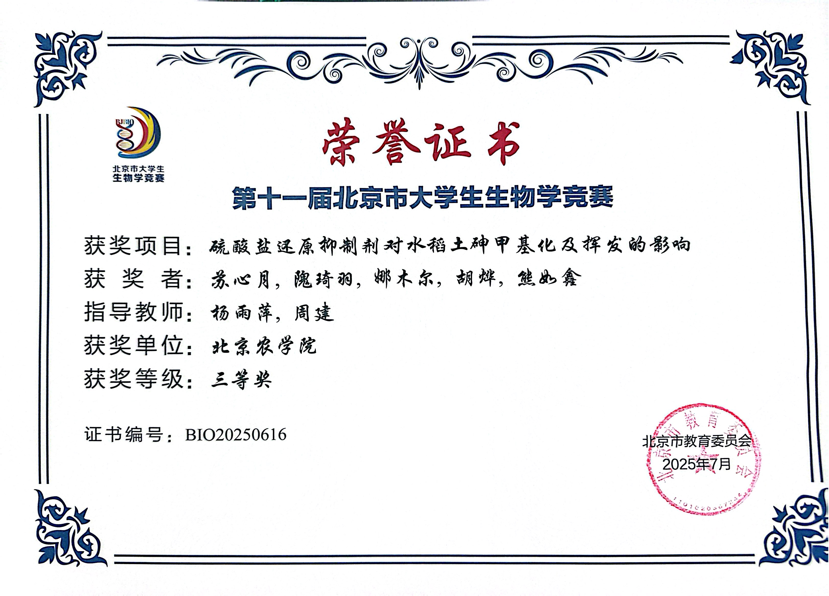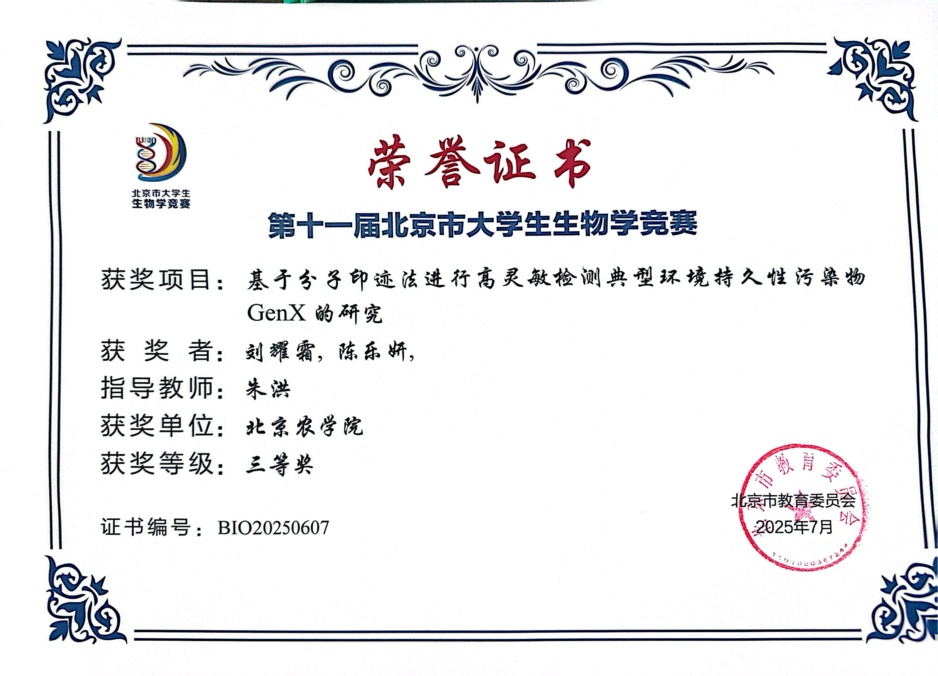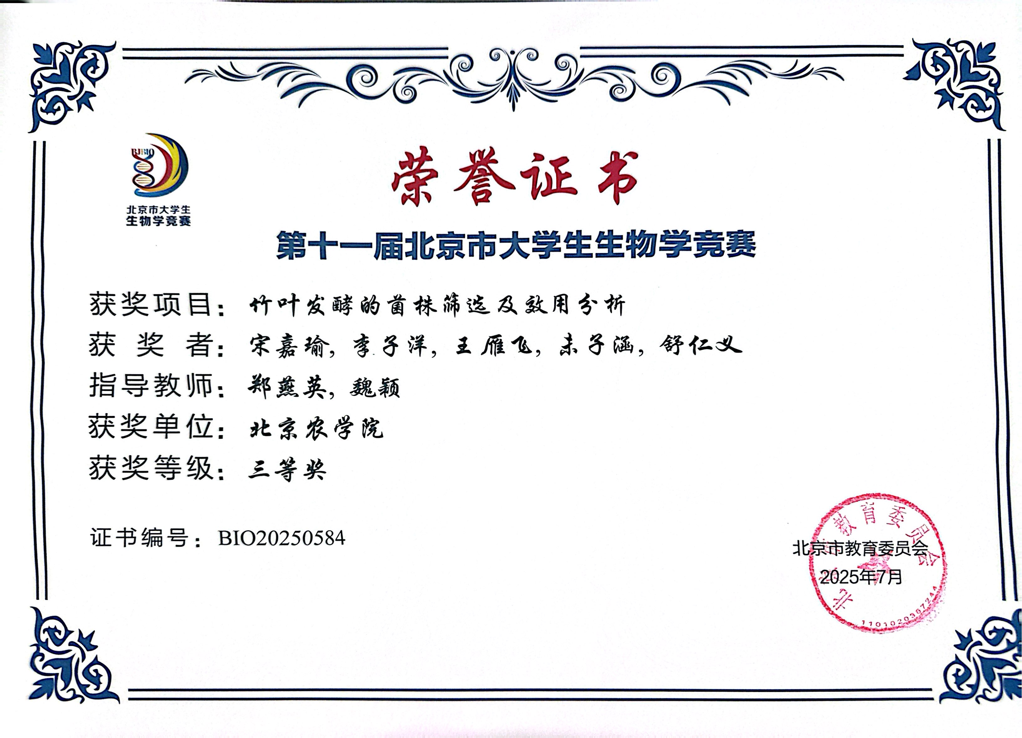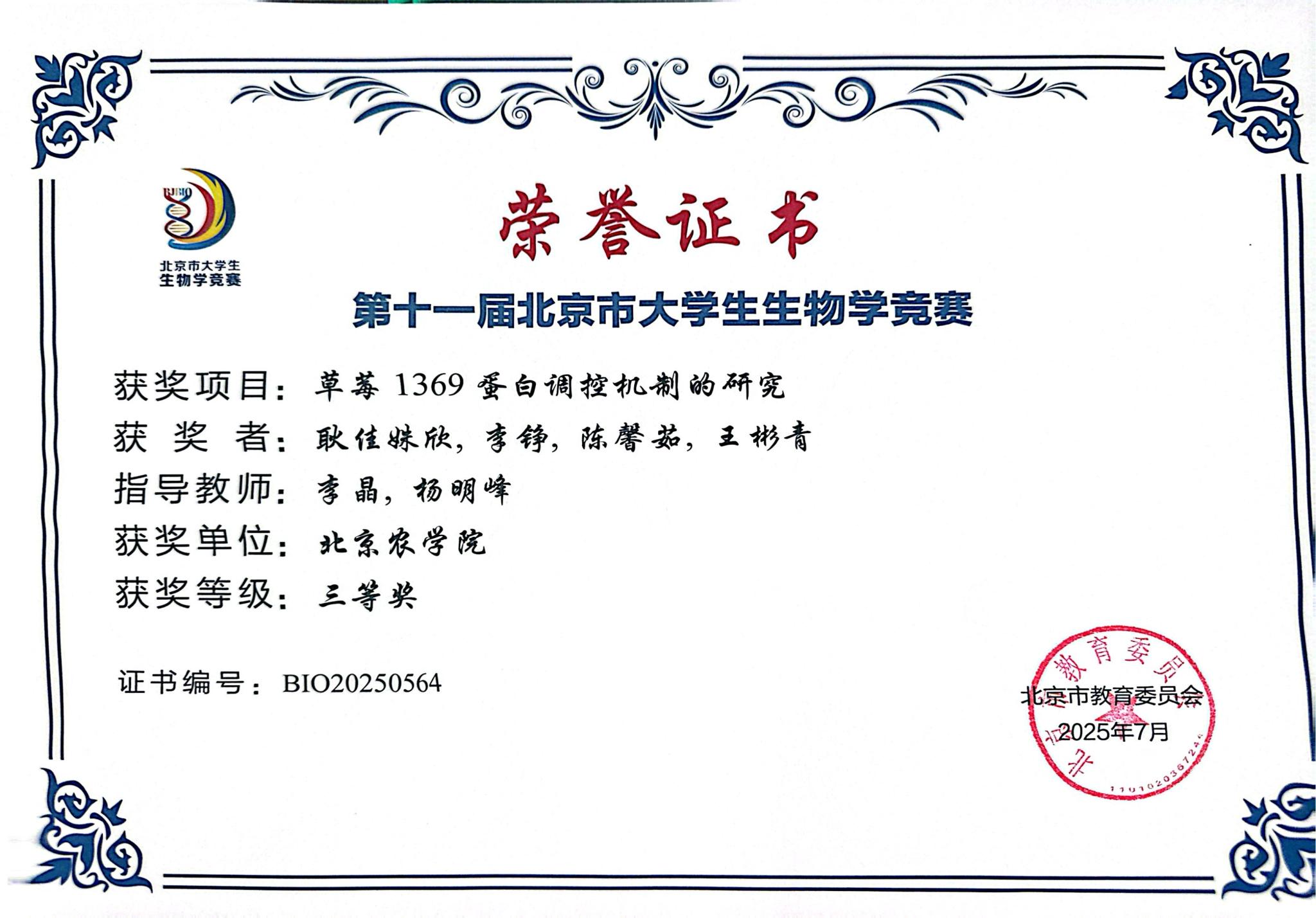 第十一届北京市老员工生物学竞赛 公司师生参赛获奖