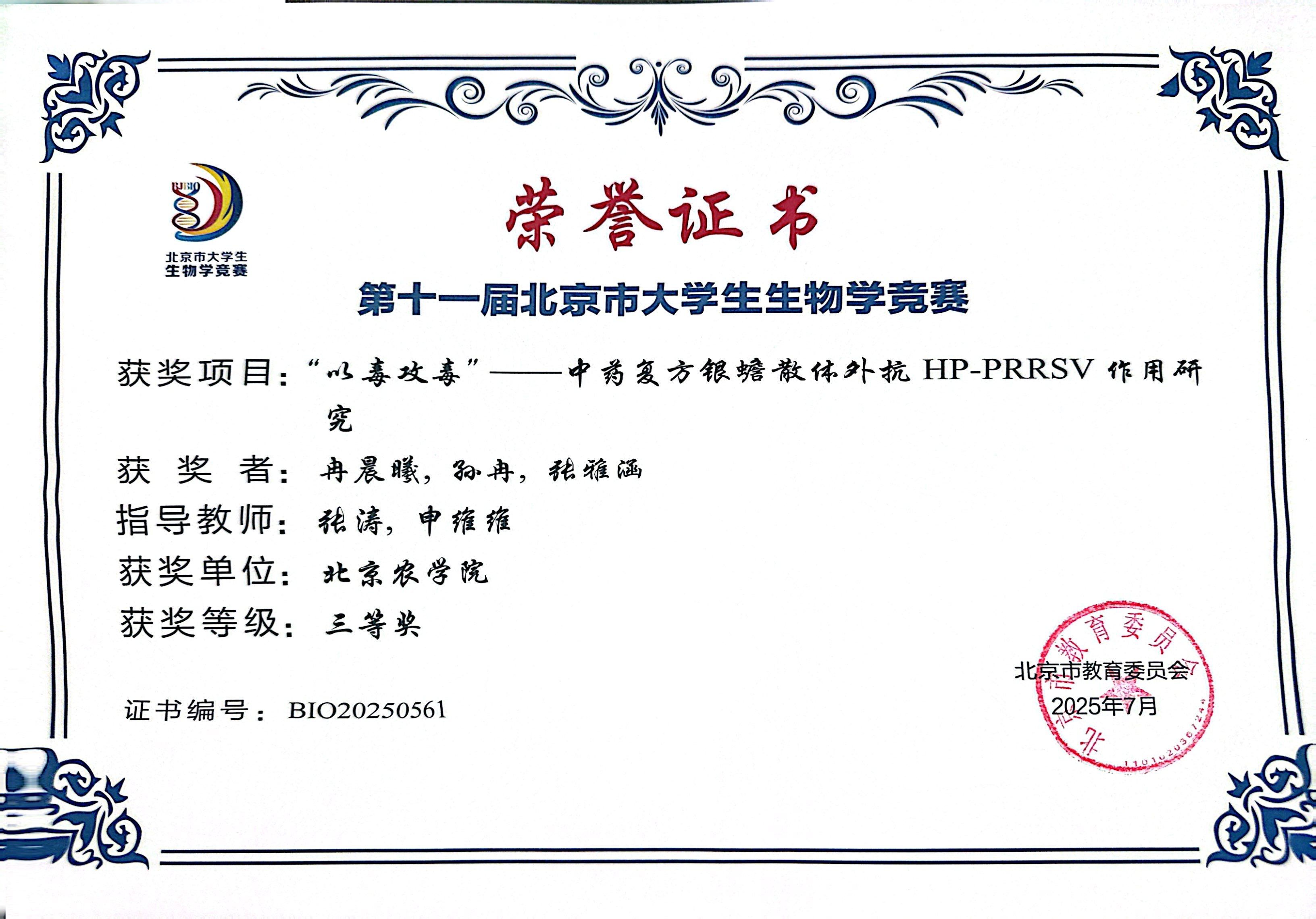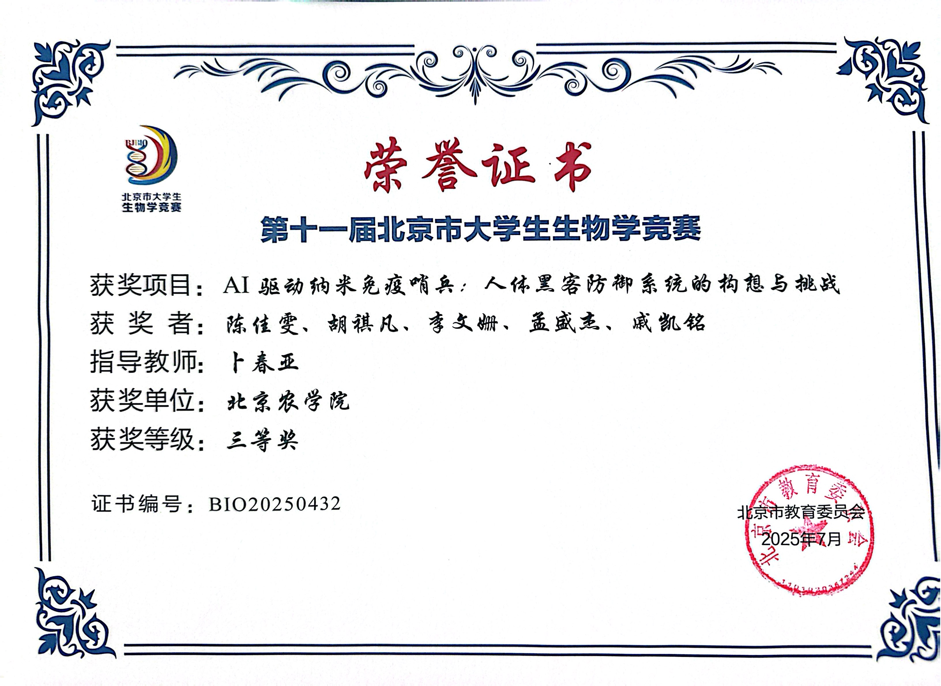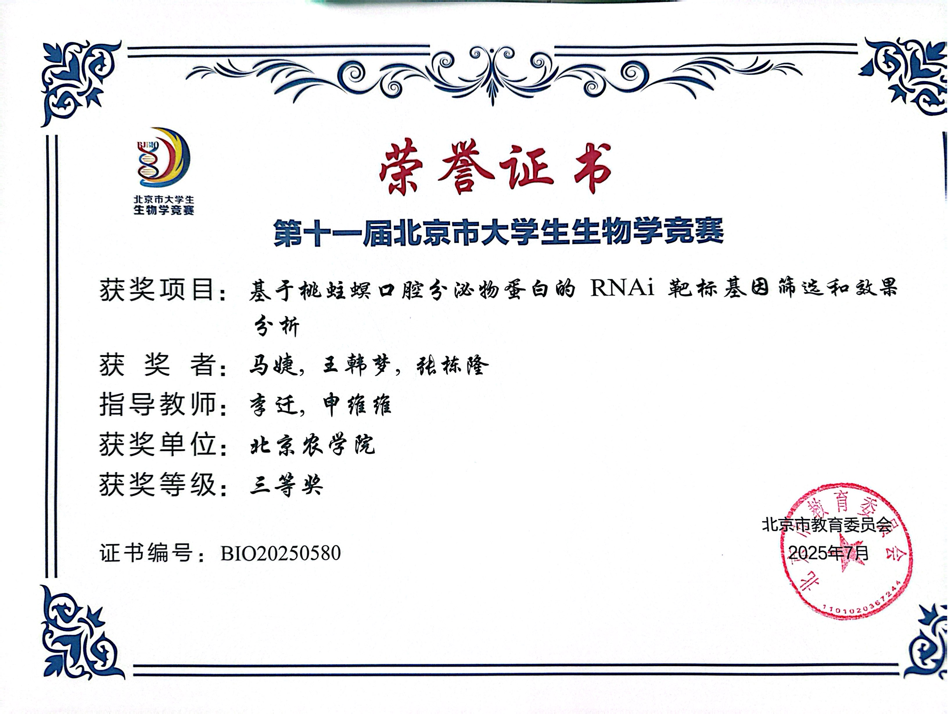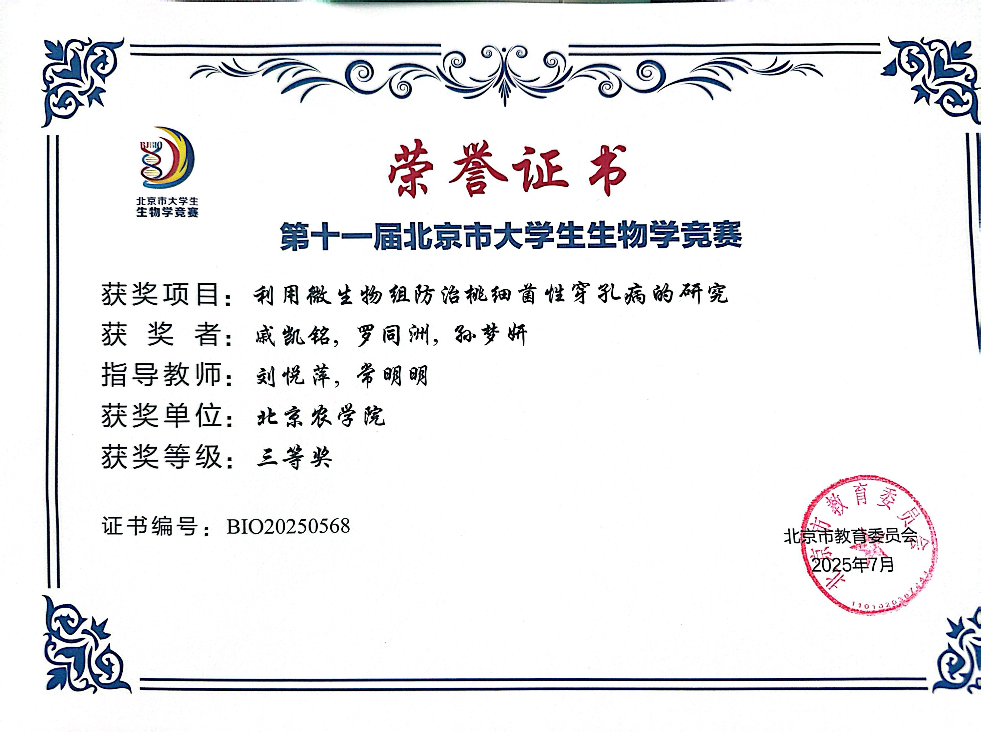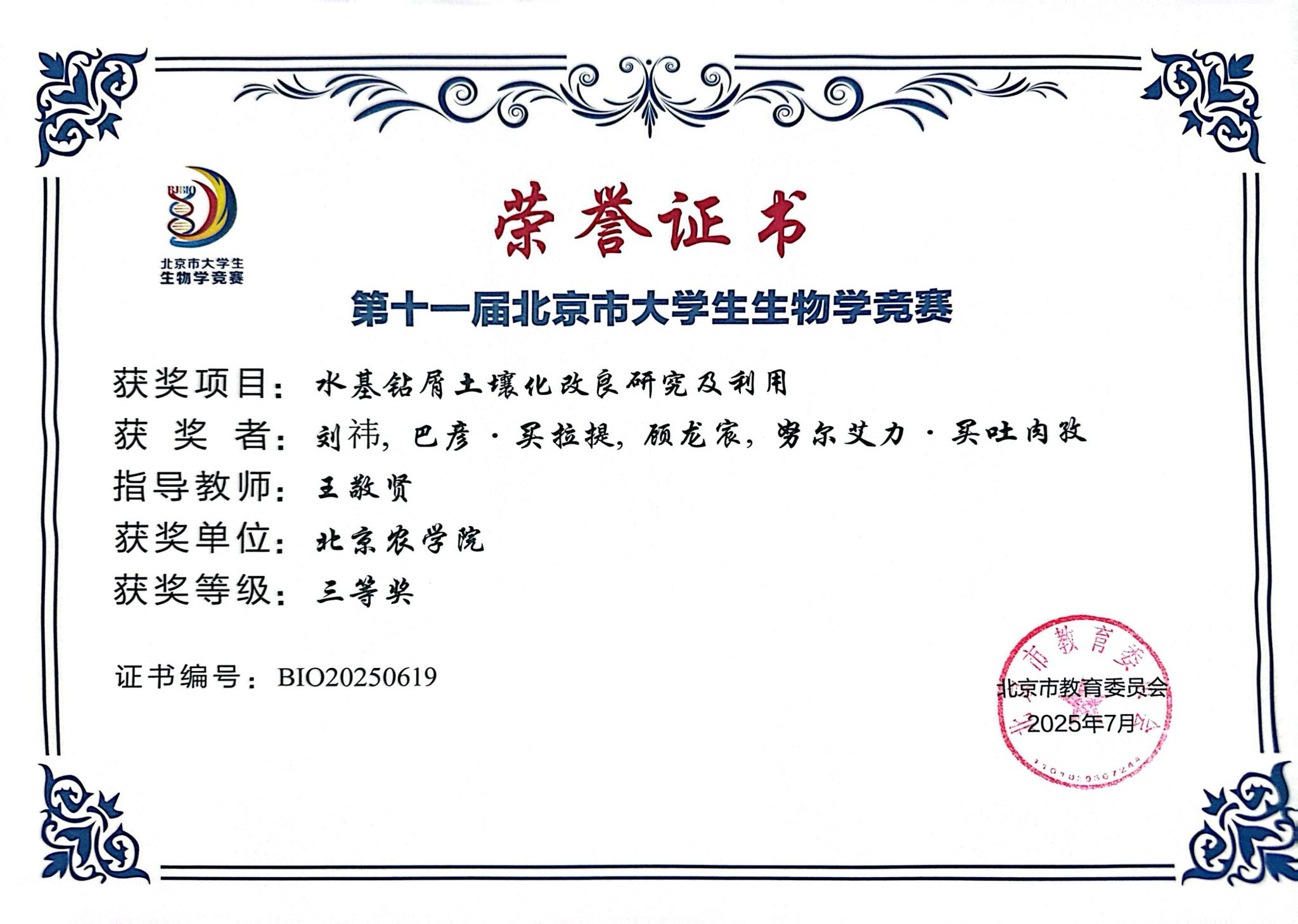 第十一届北京市老员工生物学竞赛 公司师生参赛获奖