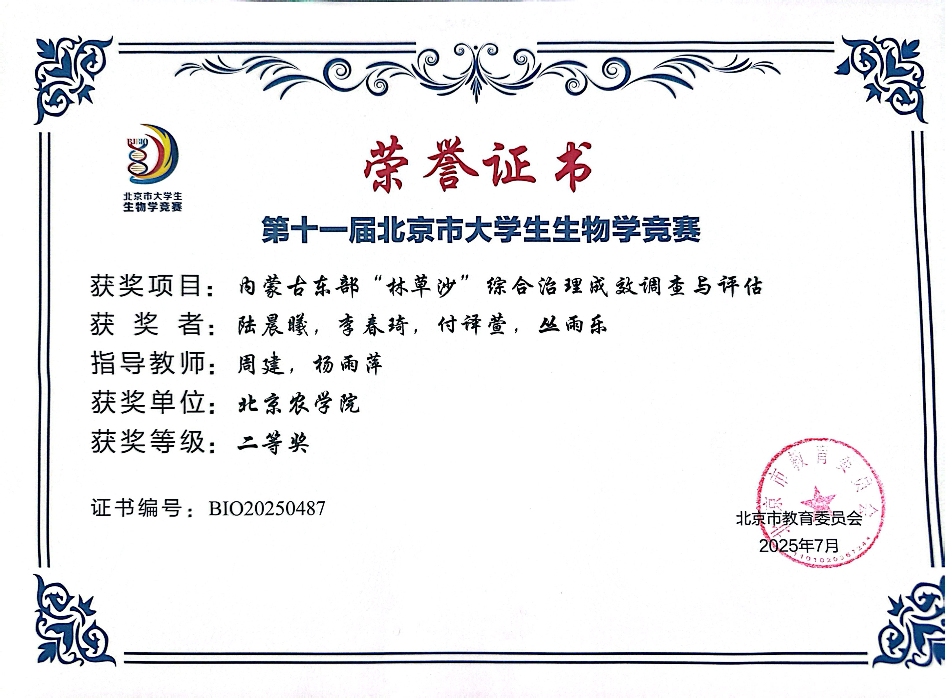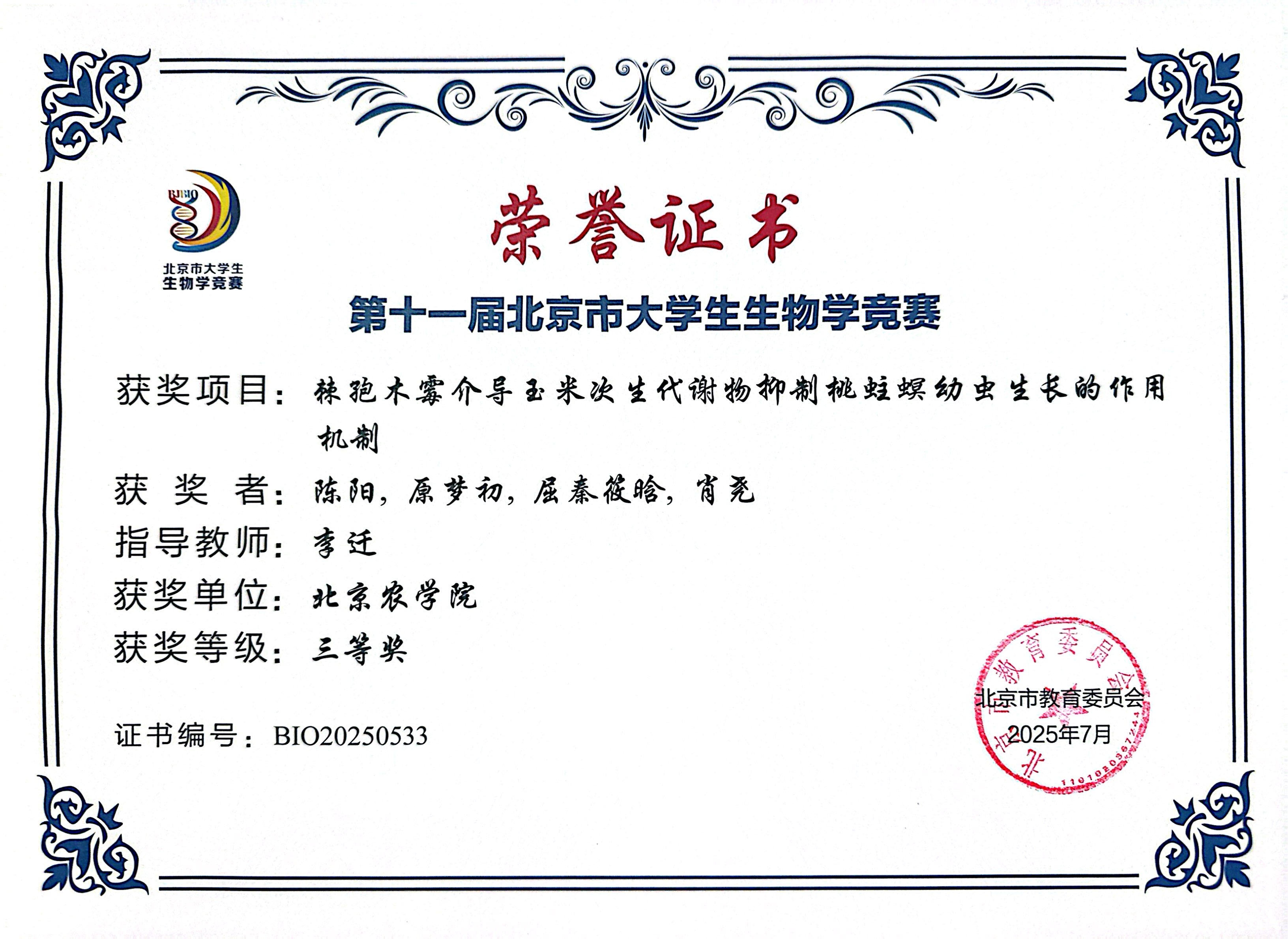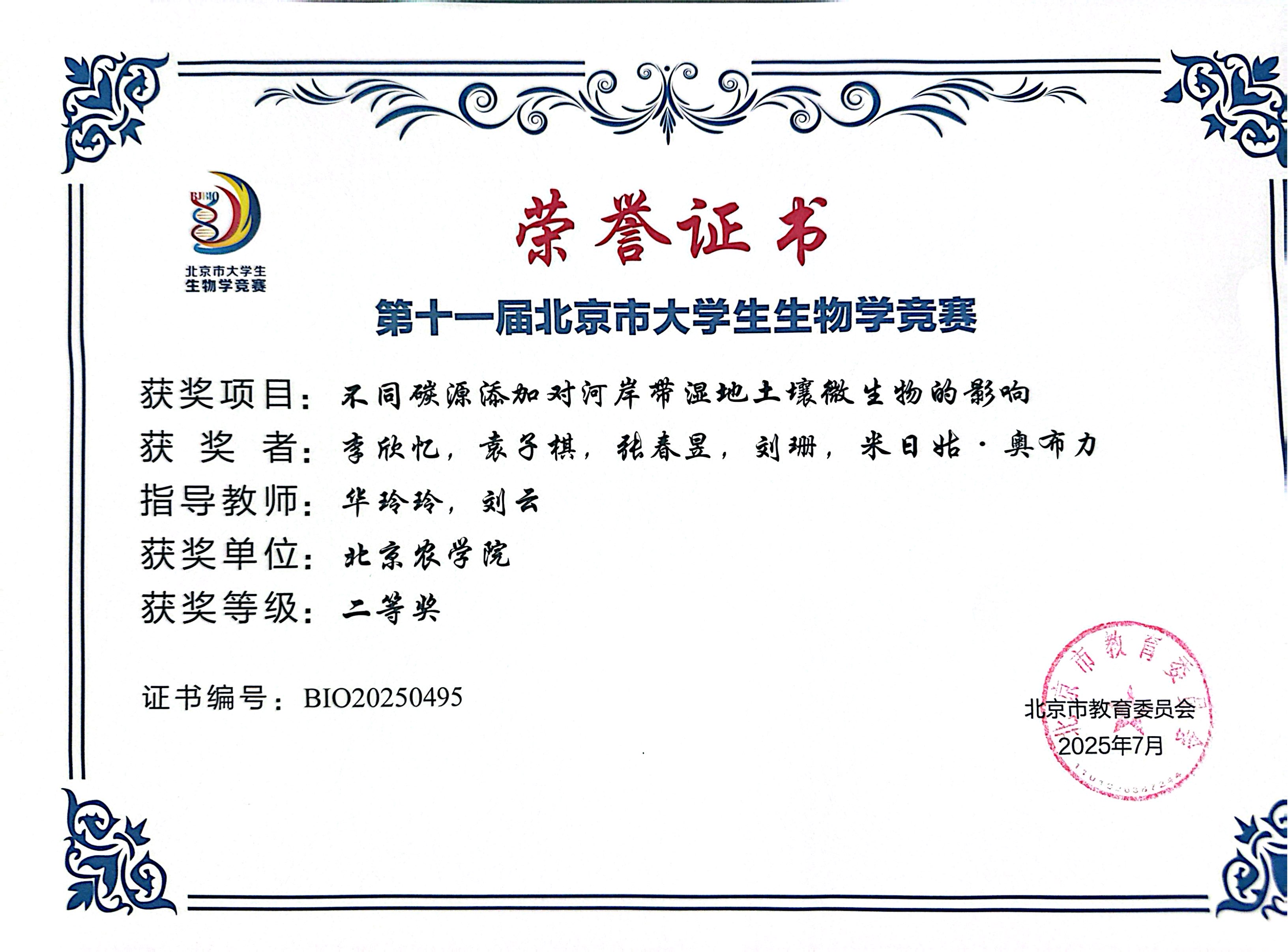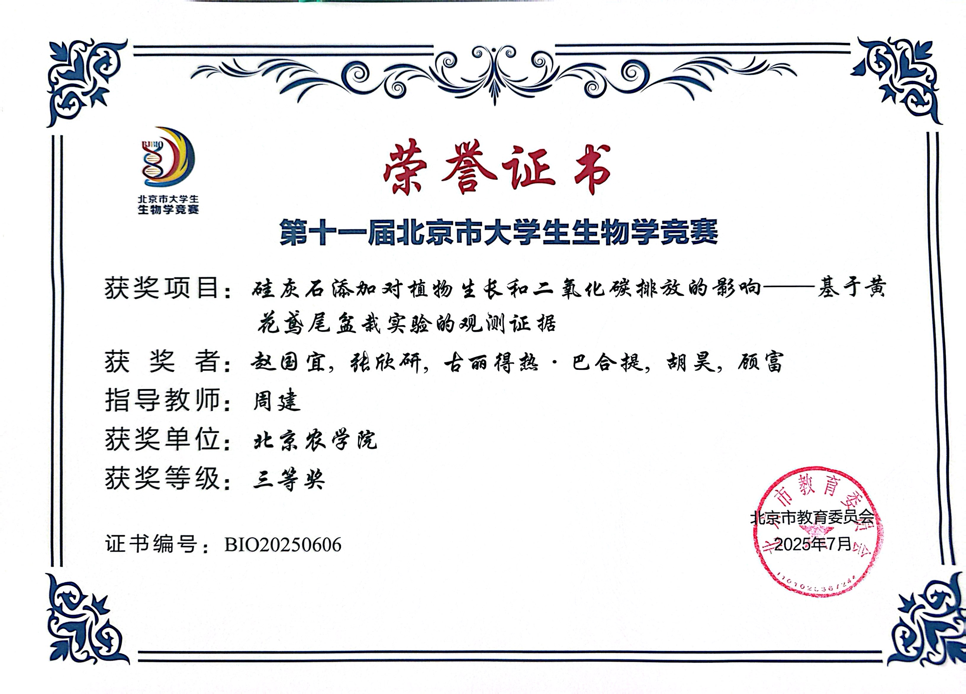 第十一届北京市老员工生物学竞赛 公司师生参赛获奖