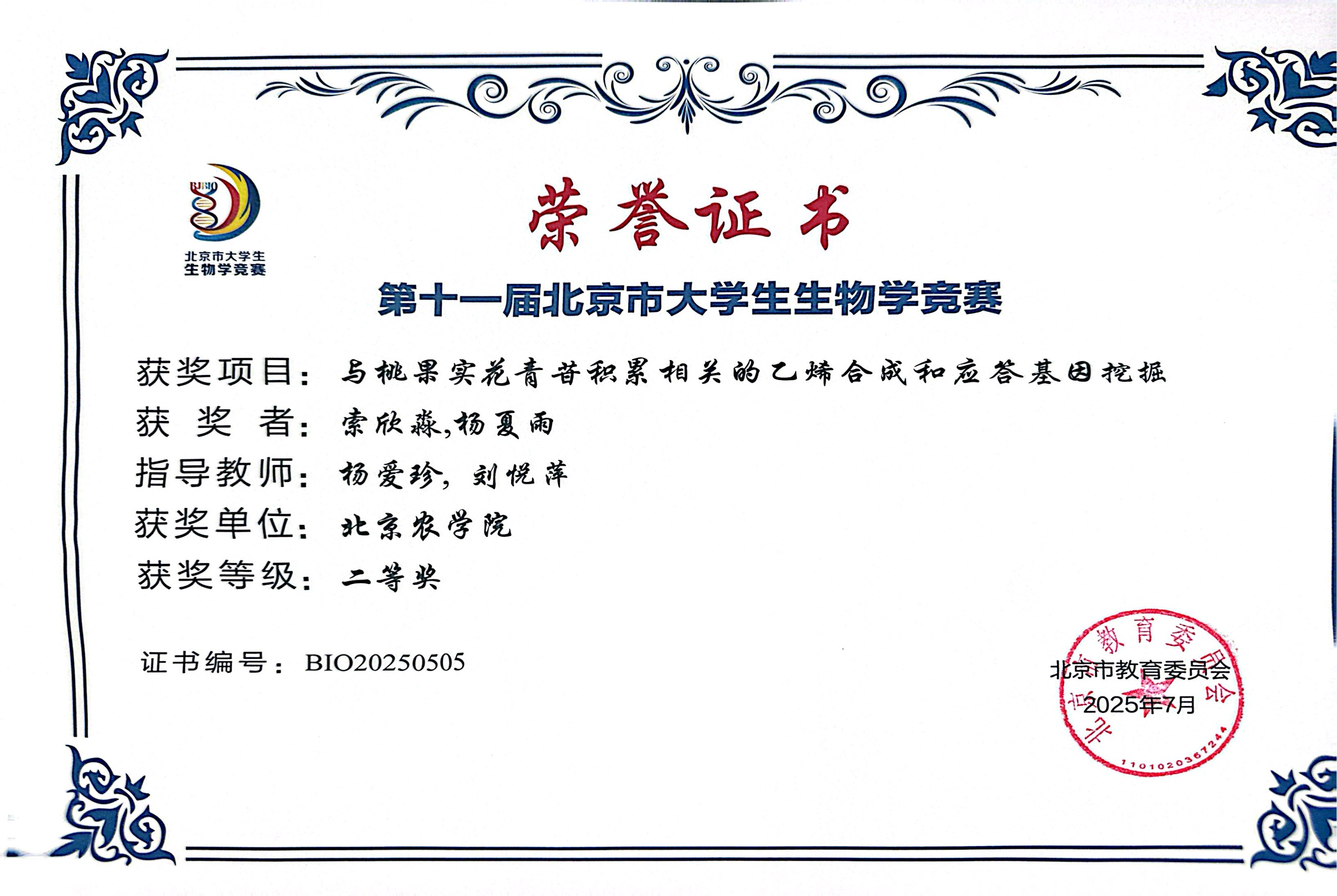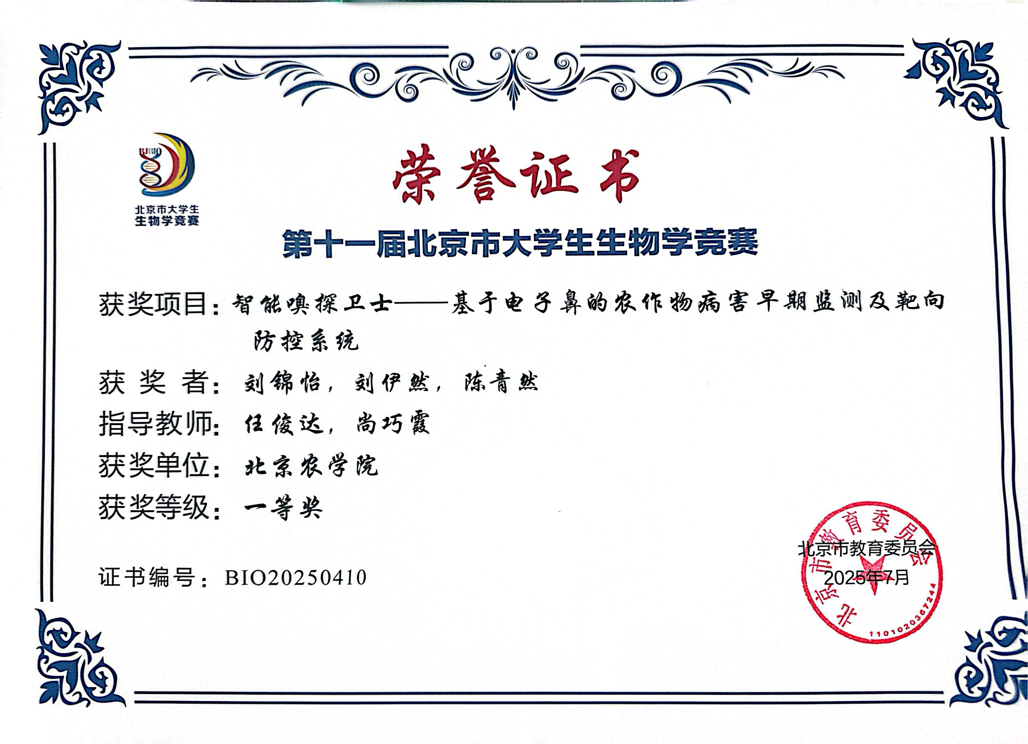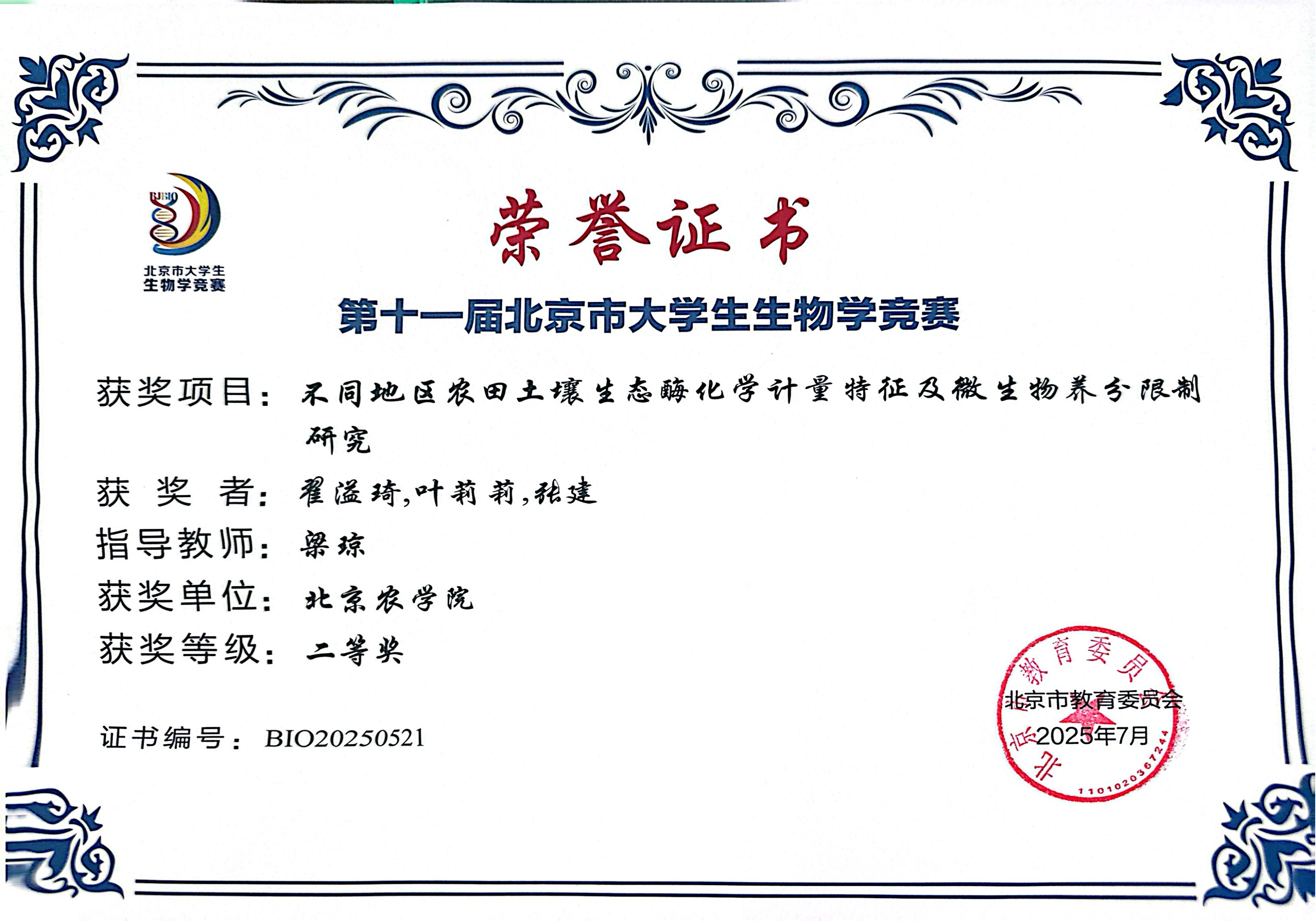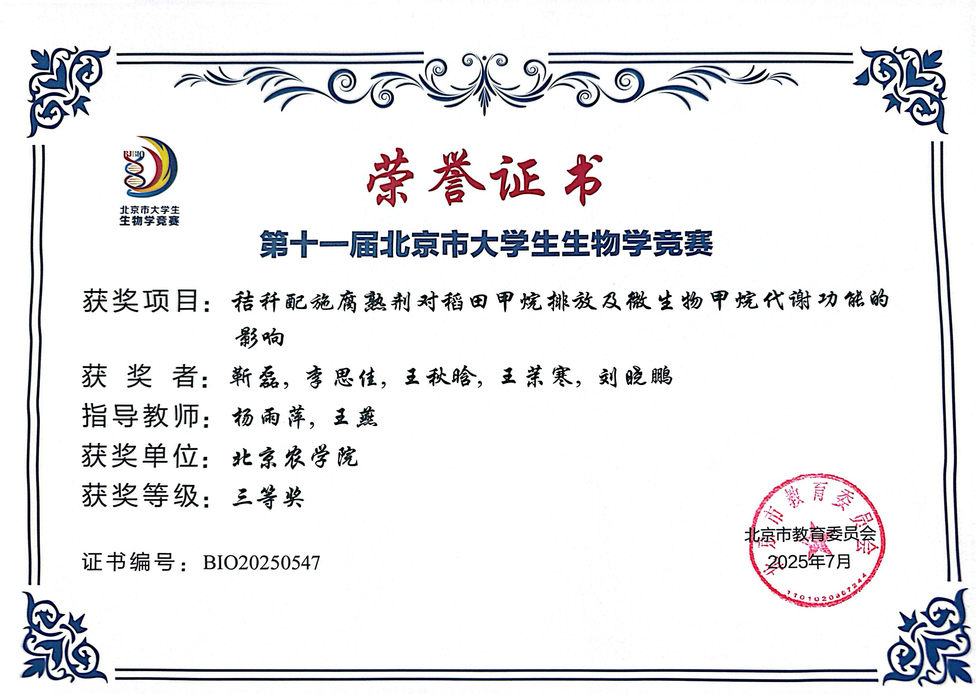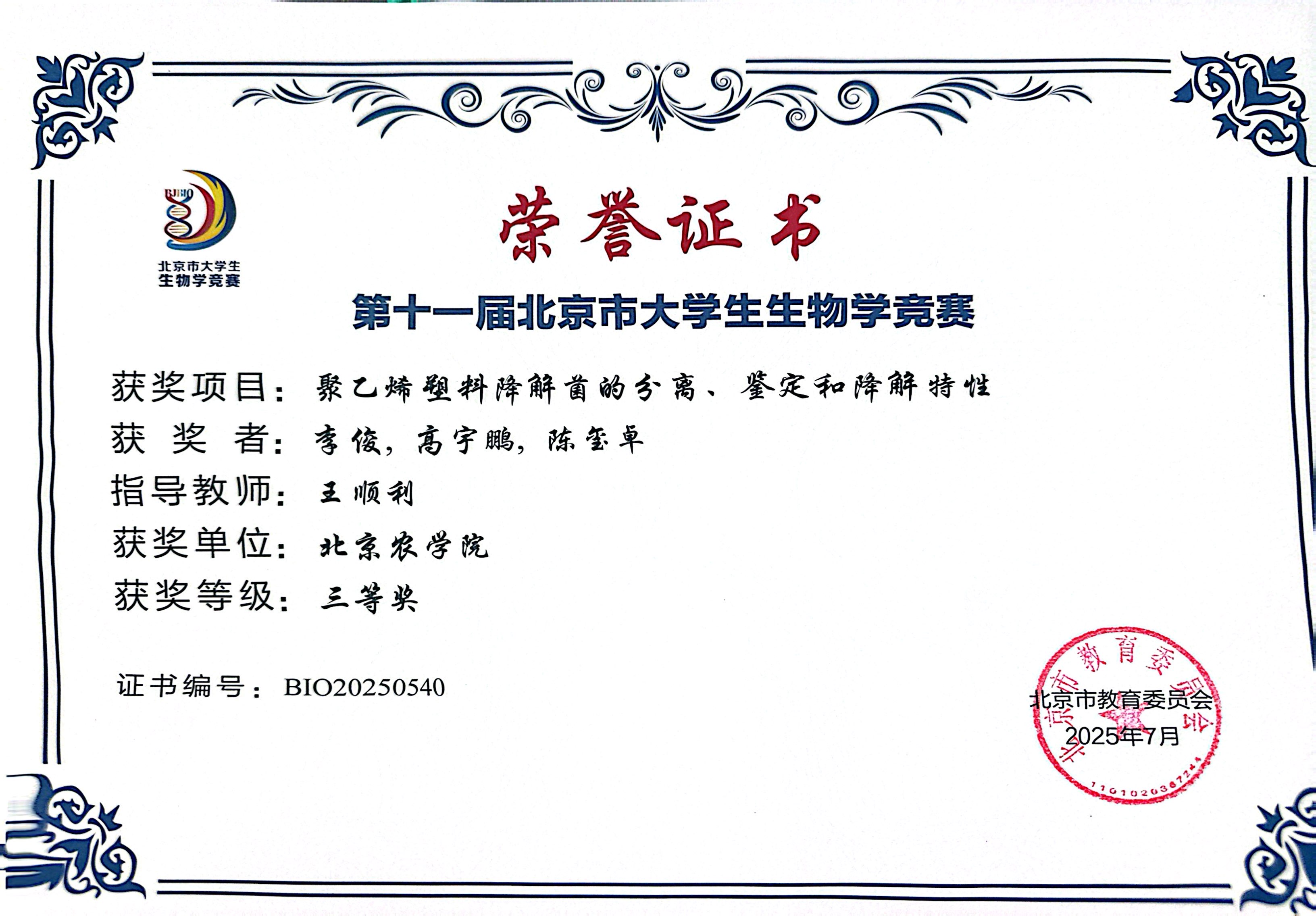 第十一届北京市老员工生物学竞赛 公司师生参赛获奖