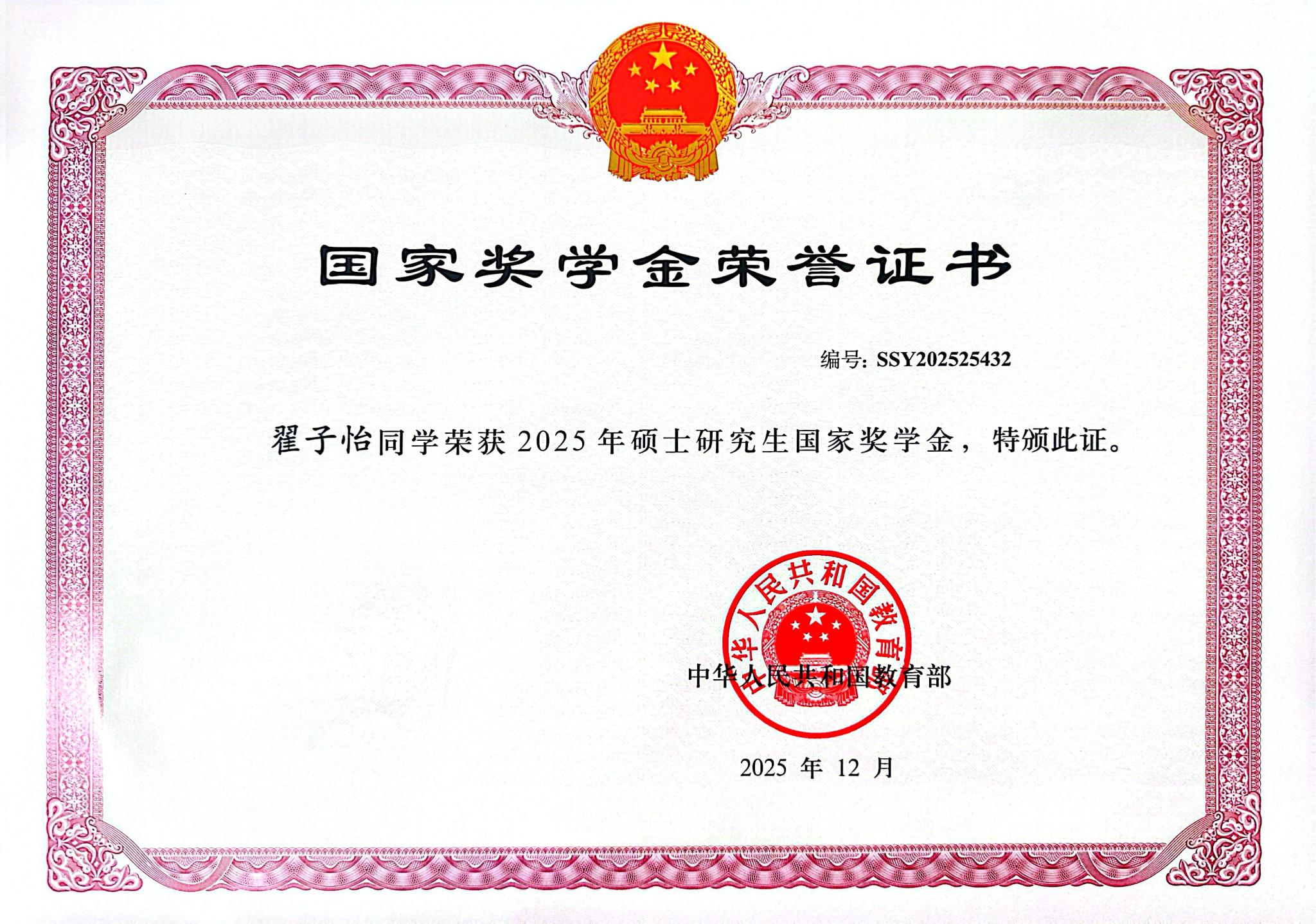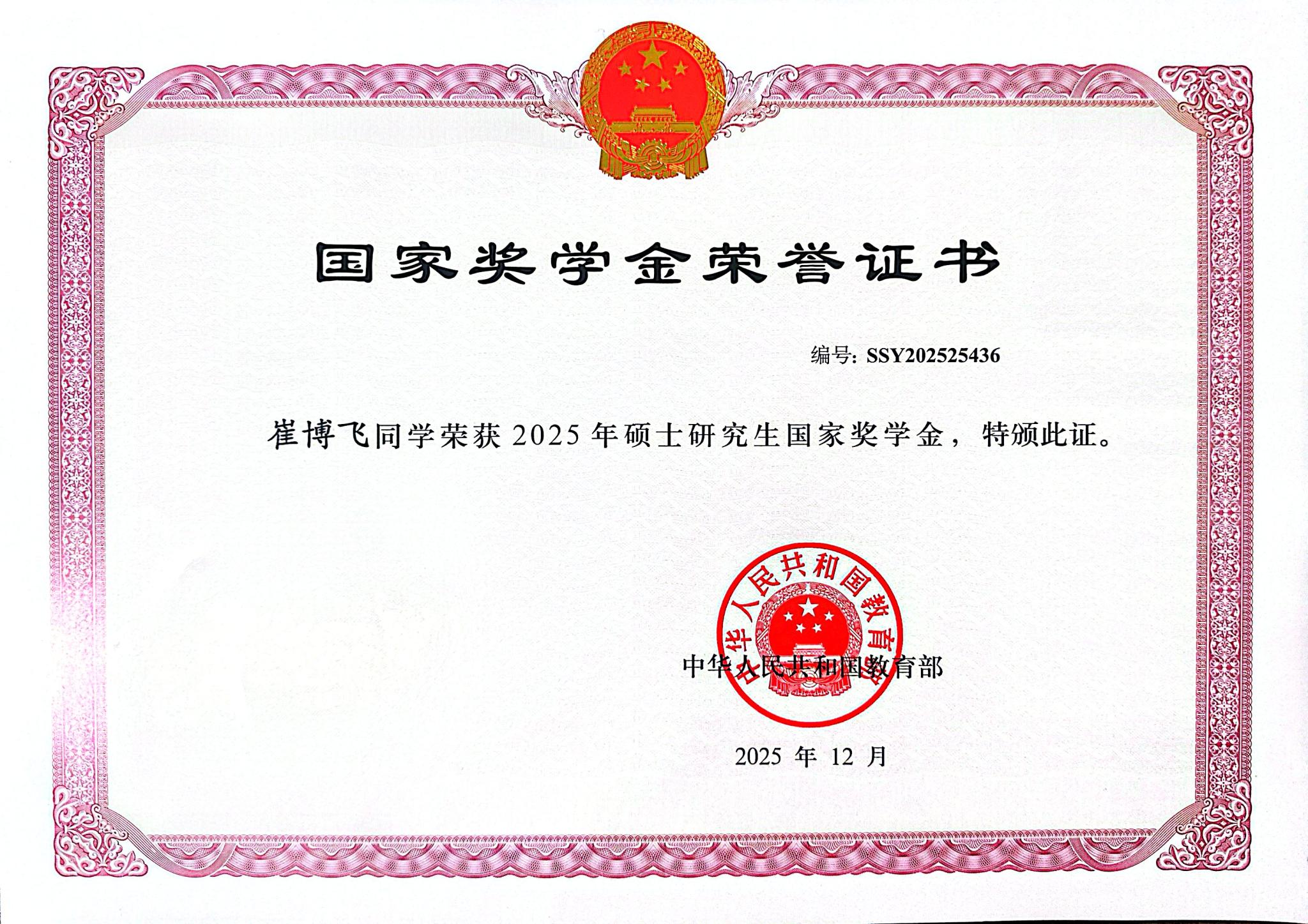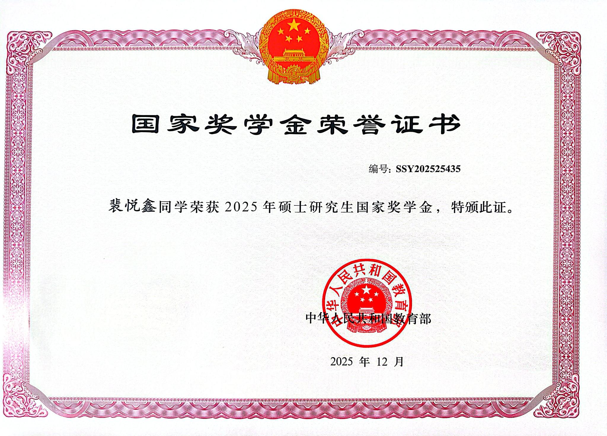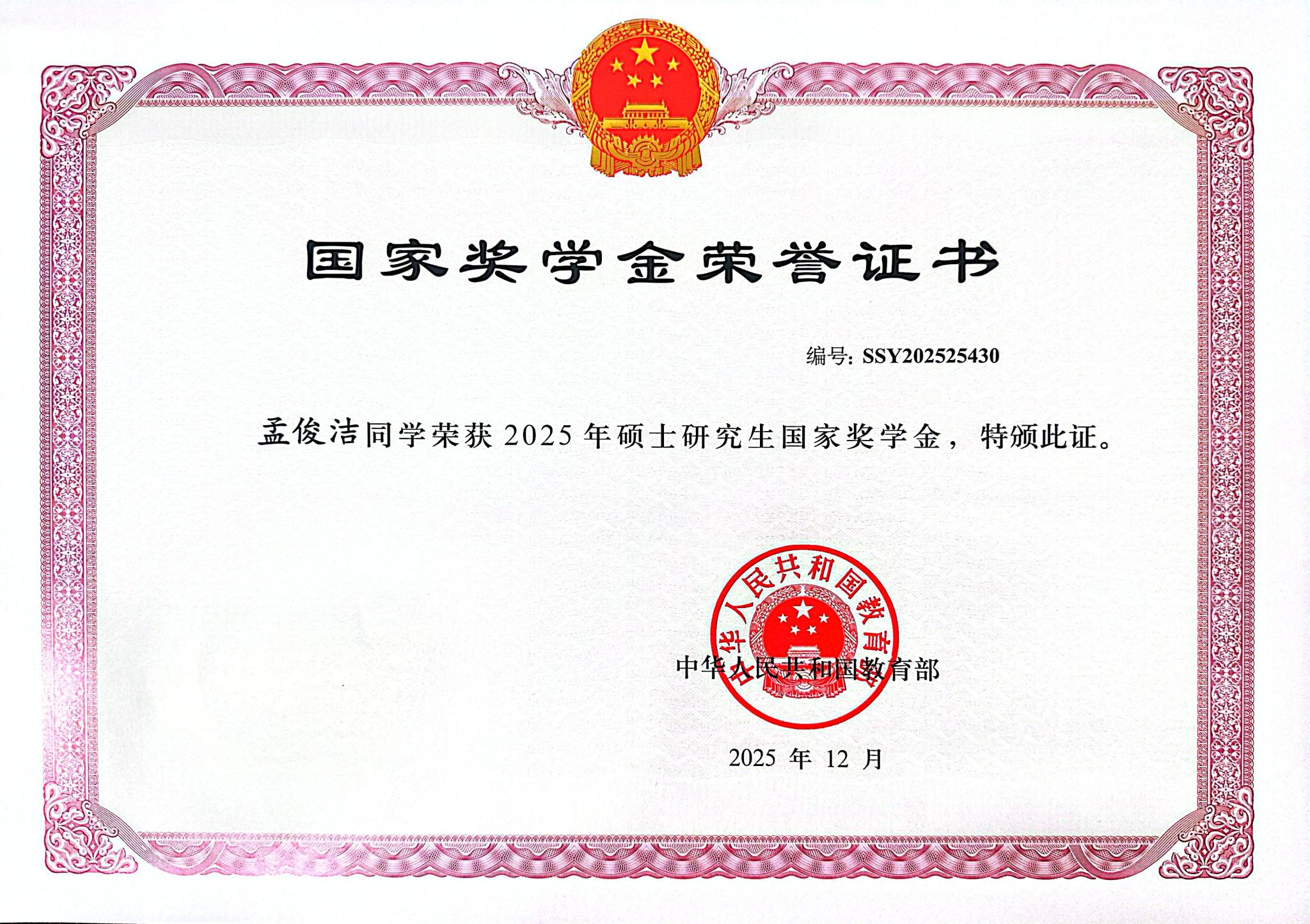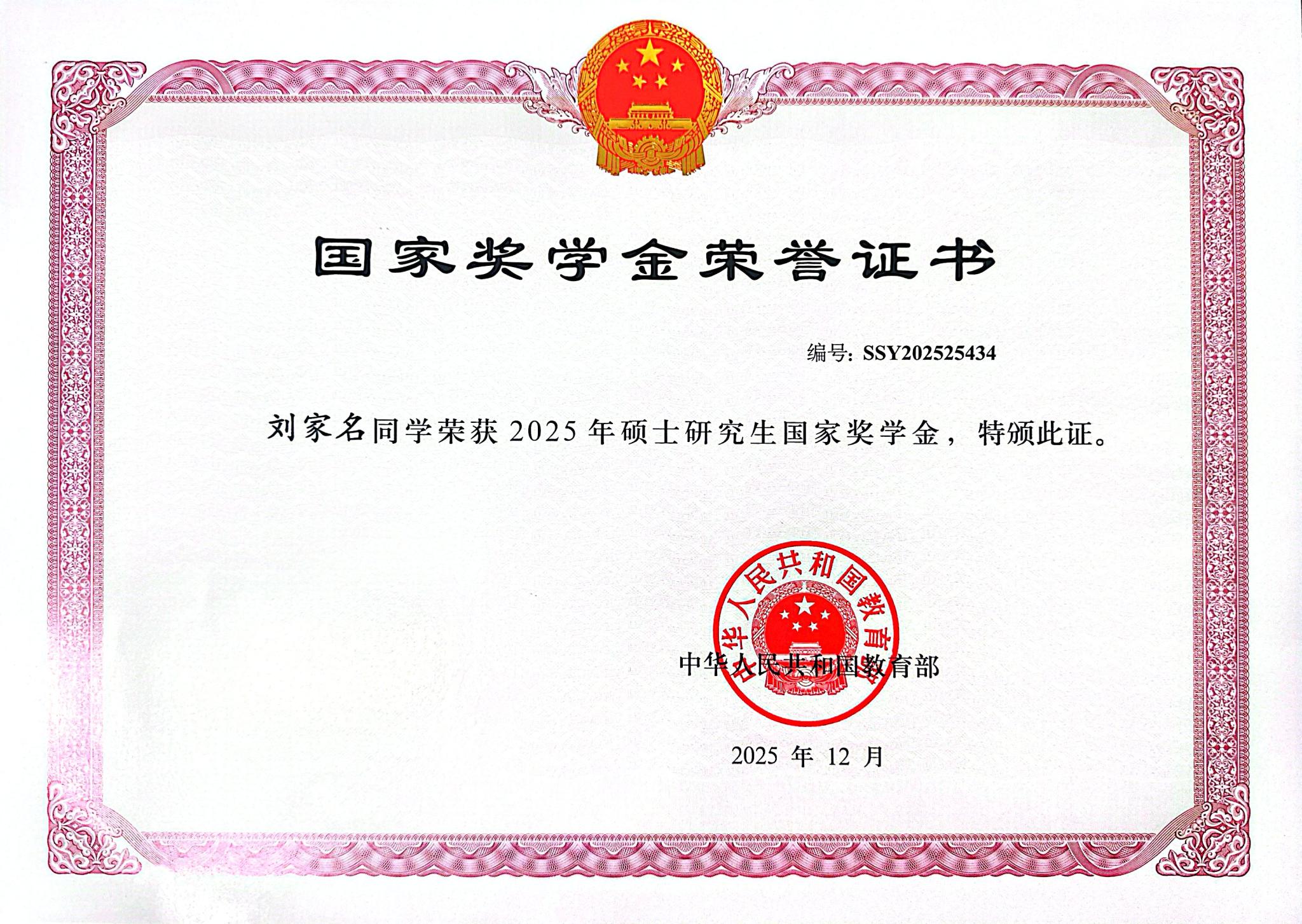 喜报!304永利集团2025年7位硕士获国家奖学金证书