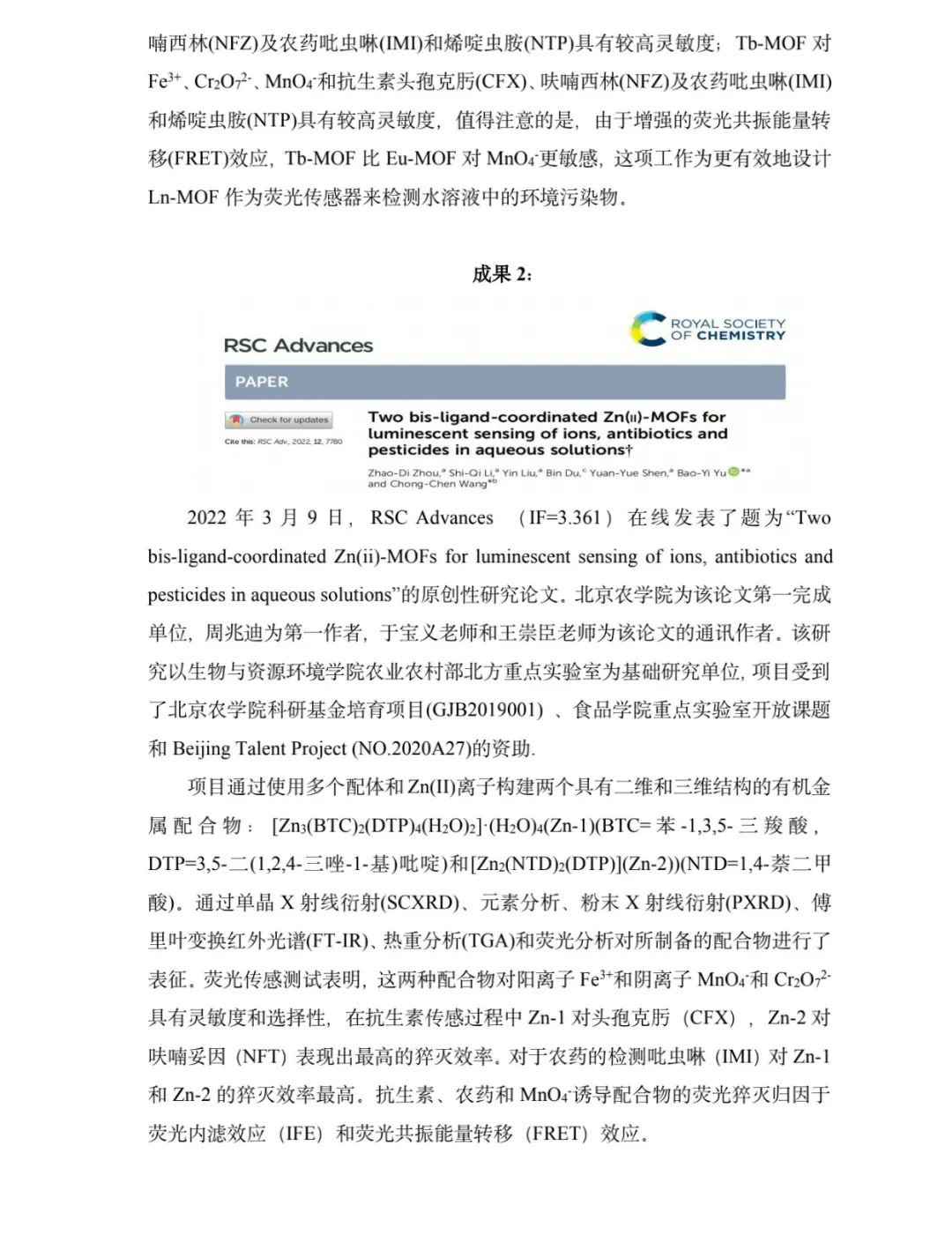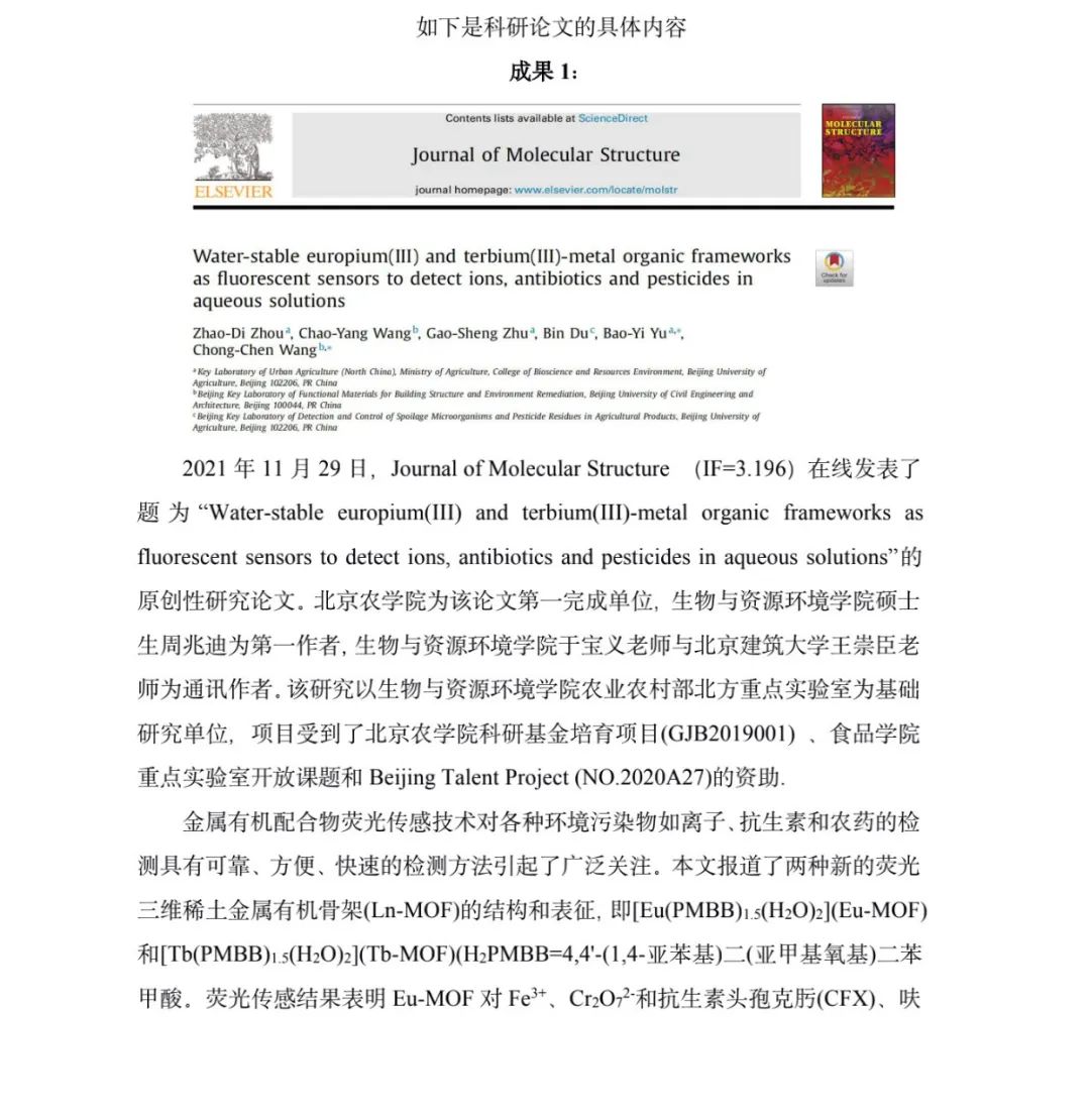 于宝义博士,硕士、博士(2015年12月)毕业于比利时根特大学,于2016年加入304永利集团官网。周兆迪是于宝义博士带的第一位硕士,于老师的专业方向是以金属有机化学为基础的应用方向。为适应304永利集团官网发展的新要求,在2020年以后,于老师以周兆迪同学为核心,由原来纯化学科研方向逐步搭建起现代农业和化学相结合的跨学科科学研究。目前,于老师成立了以专业硕士、本科生为主体的团队,全力攻坚农业结合化学的跨学科研究。目前团队主要从事环境金属污染检测、抗生素与农药残留检测、杀菌抑菌等方面的工作。课题组在融合金属有机配合物与环境保护、生物与农药、植物保护等方面做了大量研究,取得良好的科研学术成果,打下良好的科研平台基础,同时也为MOF荧光材料用于农药等污染物检测方法创新提供了参考依据。
