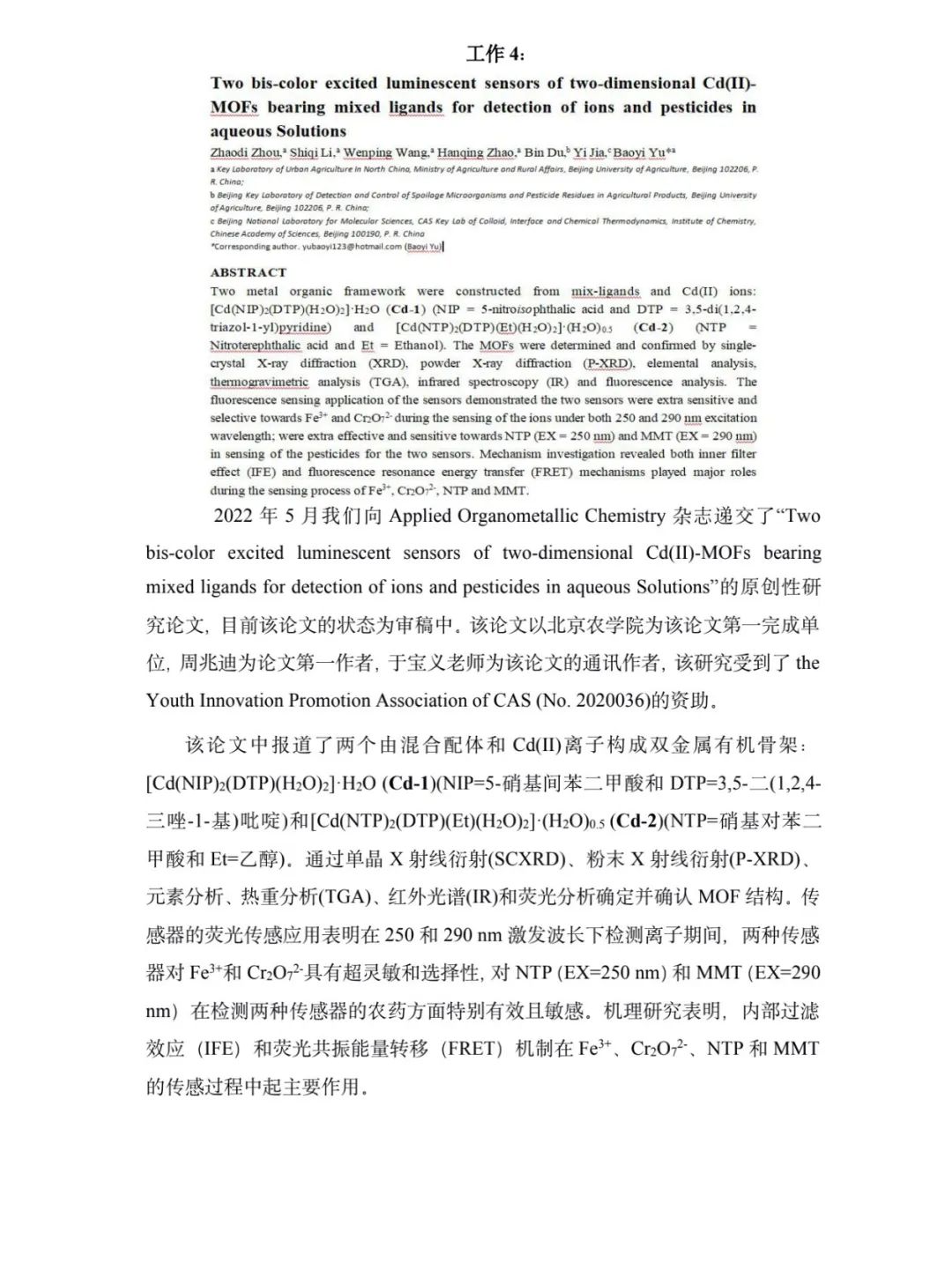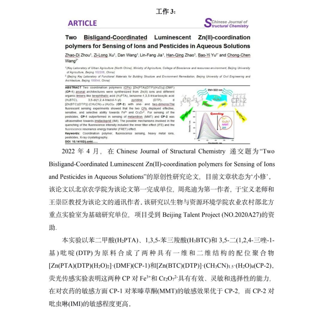 现在即将接近毕业的尾声,我已经完成了超过5篇SCI文章内容的实验工作,其中以第一作者的身份已发表文章2篇,在线小修论文1篇,在线审稿1篇,因为时间有限,最后一篇论文只能以完成实验部分的形式总结于毕业论文中。此外,除了个人主导实验外,目前本人以共同一作形式共同完成实验并正在撰写论文一篇,目前该论文写作已接近尾声,并以第二作者参与本科生发表SCI文章1篇(Polyhedron, 2022,217, 115759),除了个人实验成绩突出外,工作之余也帮助师弟师妹们完成他们的科研梦想。