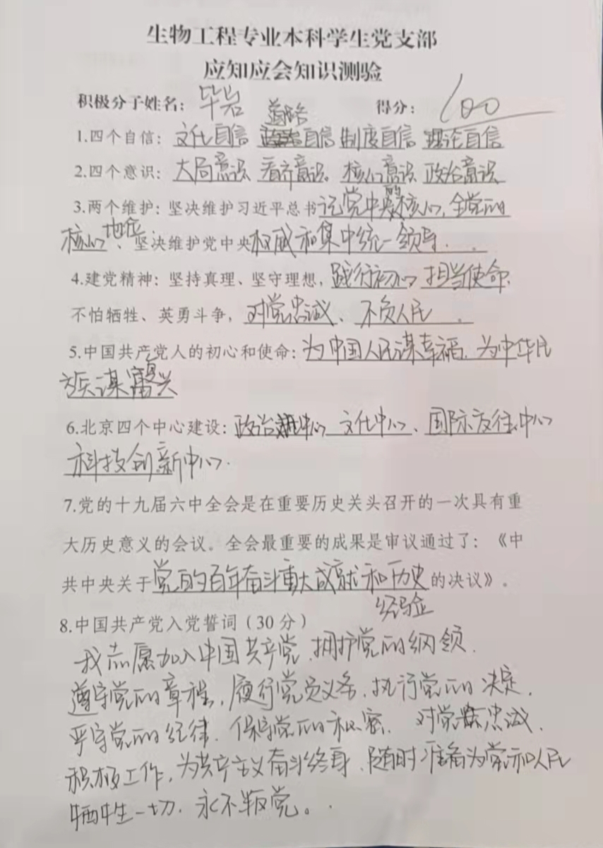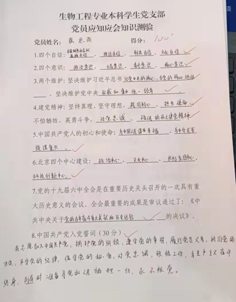 为了确保学习入脑入心,推动理论学习走深走心走实。党支部组织全体党员、积极分子开展了“应知应会理论知识测验”闭卷考试,以考促学,以学促行。最终统计后,党员平均得分为81.91。