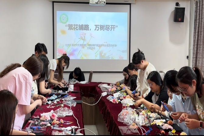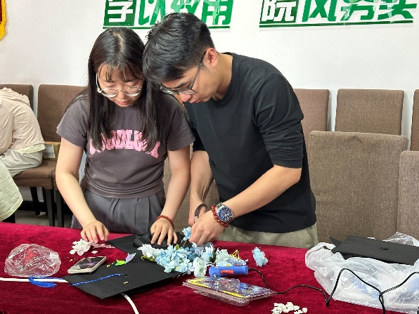 凤凰花开,毕业季悄然而至。为鼓励员工以阳光的心态迎接毕业季,给老员工涯留下更多纪念,6月3日,生物工程与植物保护研究生党支部共同开展“繁花铺路,万树尽开”主题党日活动。毕业生党员们结合专业优势,用色彩缤纷的花材设计制作独一无二的学位帽,作为难忘仲恺岁月的纪念和对未来的美好祝福。生物工程研究生党支部书记刘冰颖,植物保护研究生党支部书记申维维,2024届研究生毕业生党员与积极分子参与本次活动。