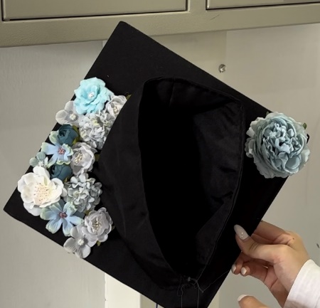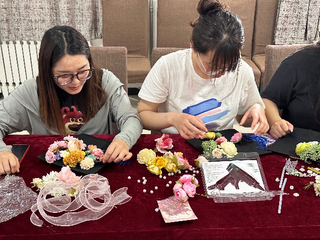 活动伊始,申维维老师给同学们介绍了簪花学位帽的制作方法,并结合所学专业知识让同学们了解到簪花活动对于促进心理健康的重要作用。随后,同学们以帽为“纸”,以花为“笔”,将朴素的学士帽点缀得五彩斑斓,一顶顶独一无二、“帽”美如花的学位帽展现在大家面前。