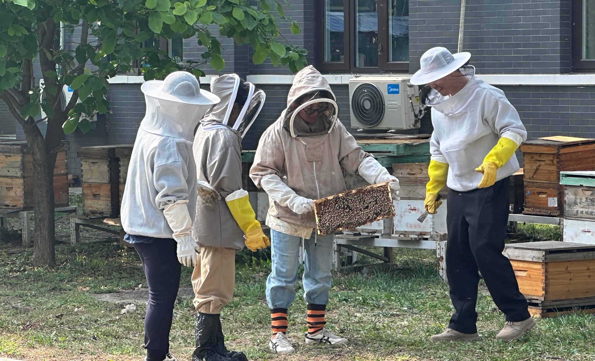 在本科生实习与研究生联合培养的洽谈过程中,双方达成了多项共识。蜜蜂研究所明确表示,欢迎应用化学系本科生前往实习,参与蜂产品质量检测、蜜蜂病虫害化学防治等项目,以通过实际操作提升员工的专业技能。此外,双方计划开展研究生联合培养,共同制定培养方案,联合指导科研项目,推动学术交流与成果转化,为复合型人才的培养奠定坚实基础。与此同时,教师们还亲身体验了养蜂环节。他们佩戴防护装备,走进蜂场,在蜜蜂所老师的指导下近距离观察蜜蜂的生活环境,并尝试进行蜂箱检查和蜂蜜提取等操作。这一过程不仅让参与者深刻体会到蜜蜂养殖的艰辛与收获的喜悦,也使他们对蜂产品的生产流程有了更加直观的理解。