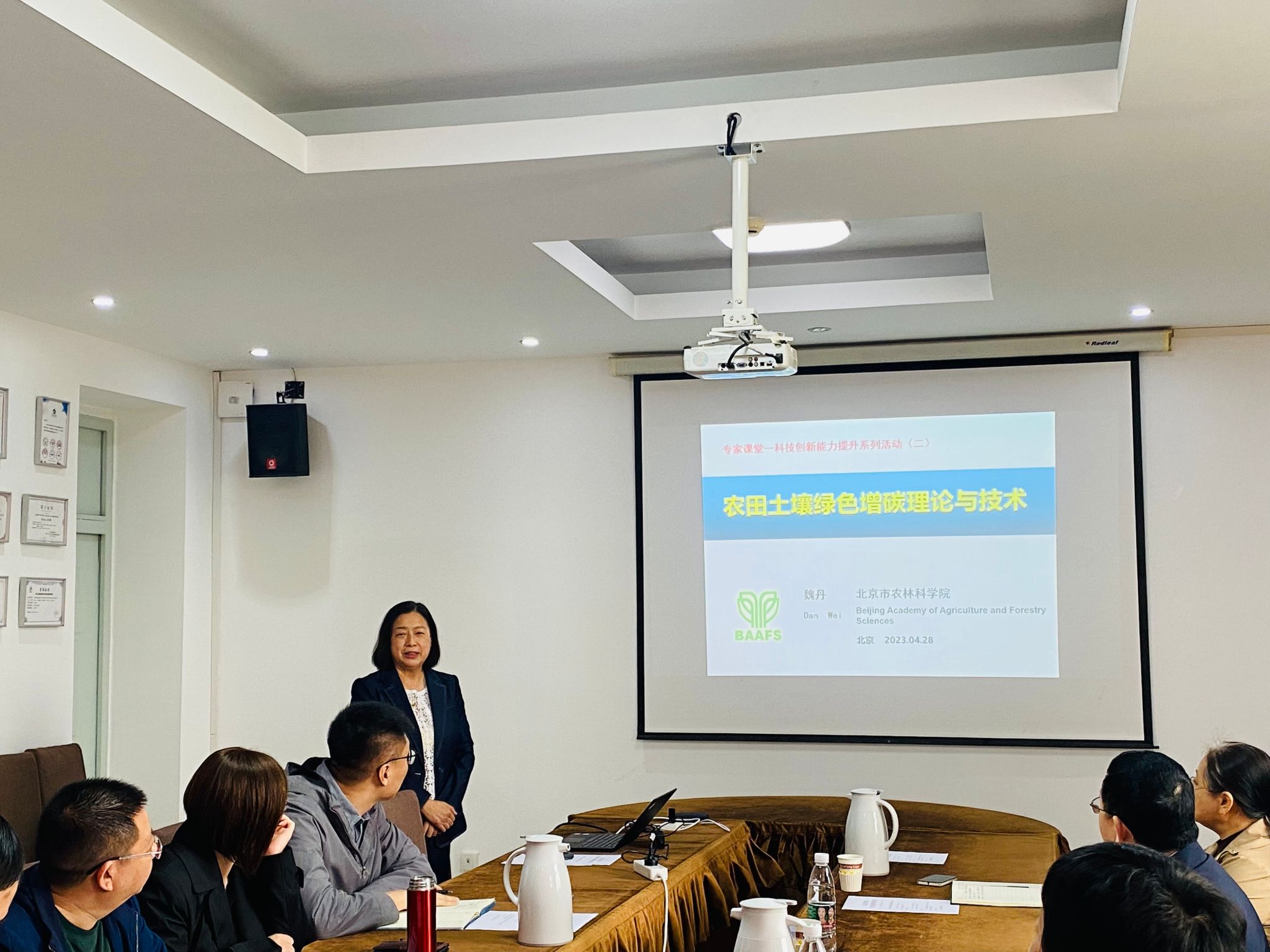 魏丹研究员从土壤绿色增碳意义、土壤增碳作用机制、土壤碳平衡与利用、农田土壤增碳技术四个方面,为在场师生作“农田土壤绿色增碳理论与技术”主题讲座,魏丹研究员深入浅出,内容详实,严谨生动,既有丰富的理论,又有大量的实践案例,使在场师生对农田土壤绿色增碳理论与技术有了更加全面的认识、更加深入的理解。公司朱新萍教授与周建讲师围绕都市农林生态系统固碳增汇做了学术交流。