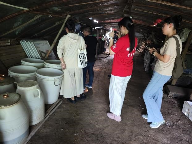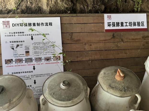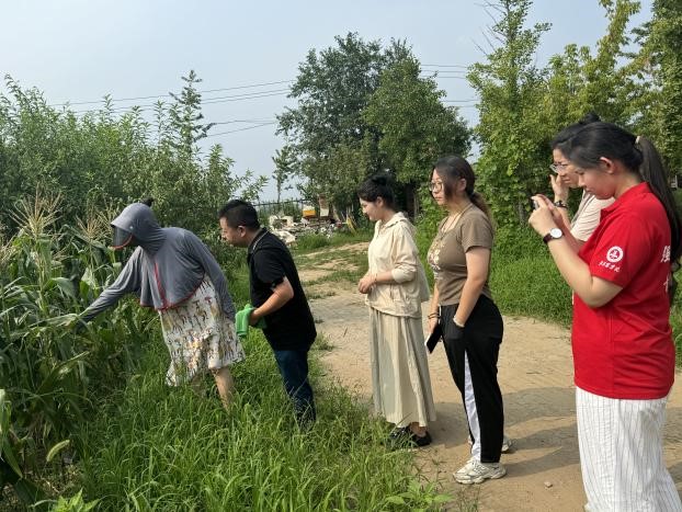 随后,实践团队在张文静带领下前往三生万物农场进行实地参观和调研。同学们参观了自然生态管理方式下种植的桃园,“老-中-青”三代错时播种的鲜食玉米,采用有机方式种植的蔬菜等,并学习了DIY环保酵素的制作流程,亲身体验了看似“粗放”的管理中蕴含的近自然生态种植理念,以及其中所体现出的植物-动物-微生物生态链和良性生态循环。