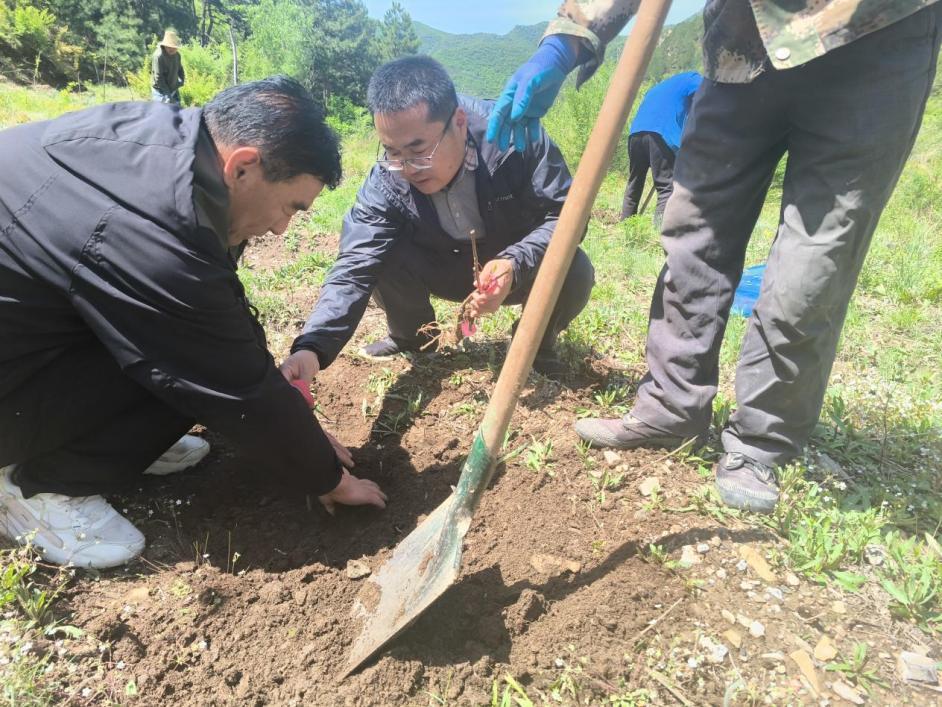 田间地头,师生们与农户一起挥锹挖坑、栽苗培土。研究生一边劳作一边与农户交流:"大叔,您看这个根系使他舒展一点放,坑再浅一点,成活率会更高。"研究生们一边栽苗,一边讲解栽培要点。"这些老员工干活踏实,讲的技术也清楚。"水头村焦书记竖起了大拇指。