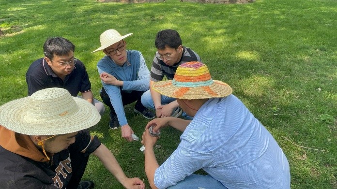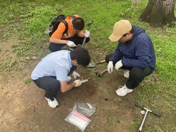 在工作的第一周,同学们就体验了闷热多雨的“桑拿天”。实践过程中的天气是多变的,时而阴雨绵绵,时而烈日当空,闷热潮湿的天气给同学们的实践活动带来了不小的挑战。22级资环本科生陈永刚同学感叹道:“这几天的天气特别闷热,每次钻土、挖土、取土都会让我大汗淋漓。有一次土样取到一半突然下起骤雨,只能打伞继续坚持,不然就会前功尽弃。这些经历都是在课堂上体会不到的。” 22级资环本科生阿克力江●阿里木同学说:“这次实践活动让我更加深刻地体会了城市绿地建设者的辛劳。作为农公司的员工,能够为世界遗产天坛公园的绿地质量提升贡献一点力量,我们感到任重道远。”